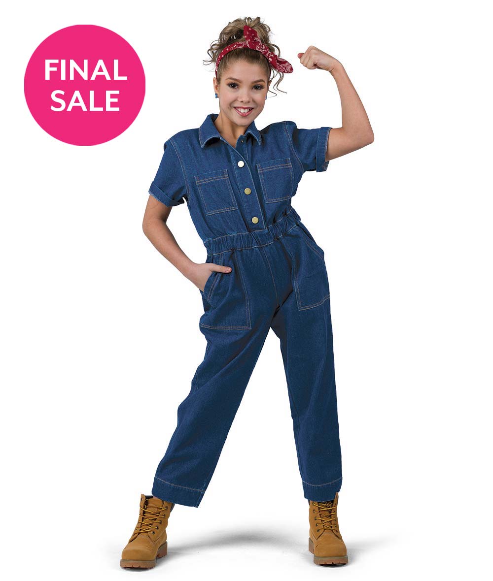 Non-stretch denim jumpsuit with elastic waistband and snap front. Headband sold separately. Imported.