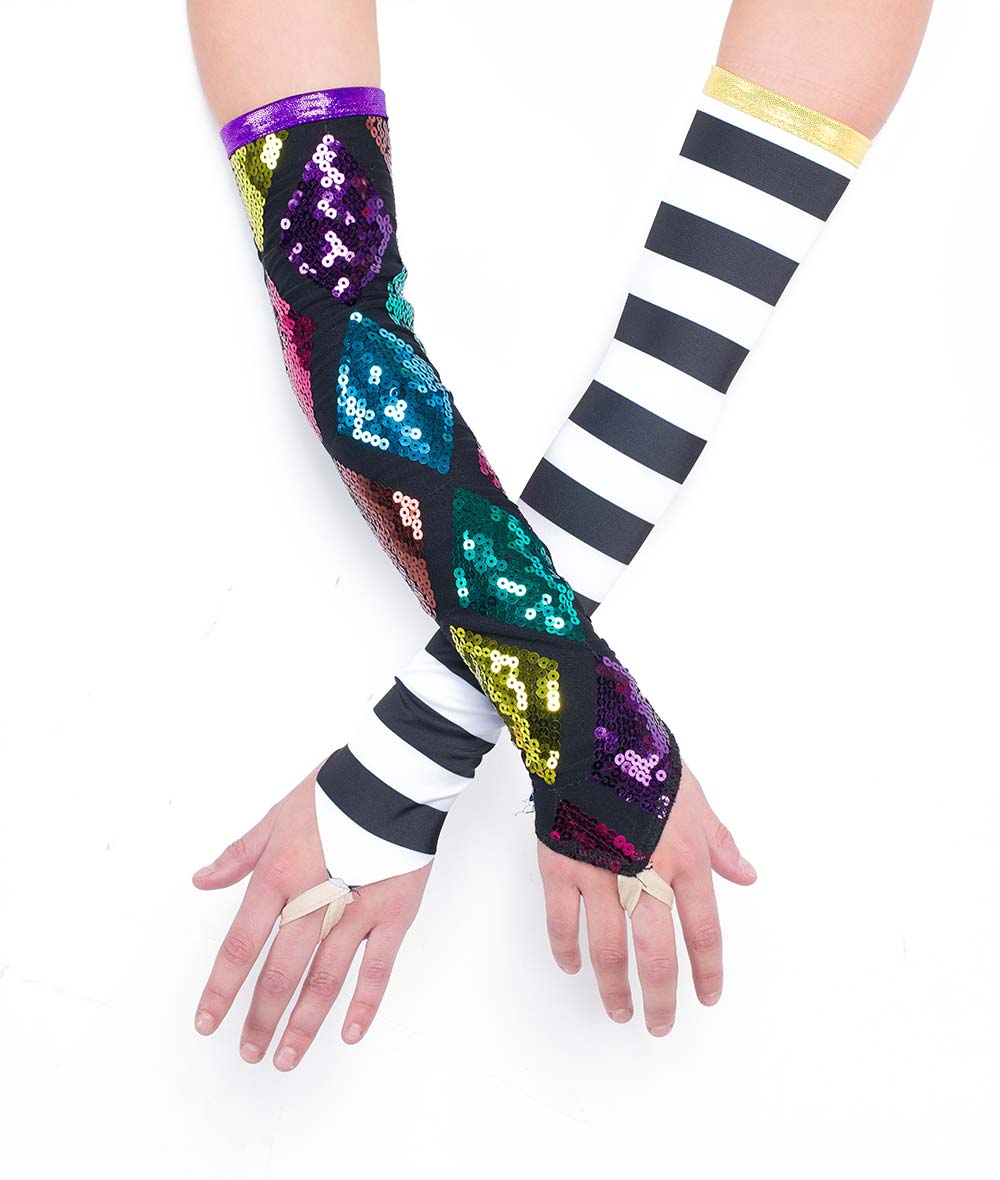 Diamond pattern sequin and striped spandex over-the-elbow mitts with elastic finger loops. Made in the USA.