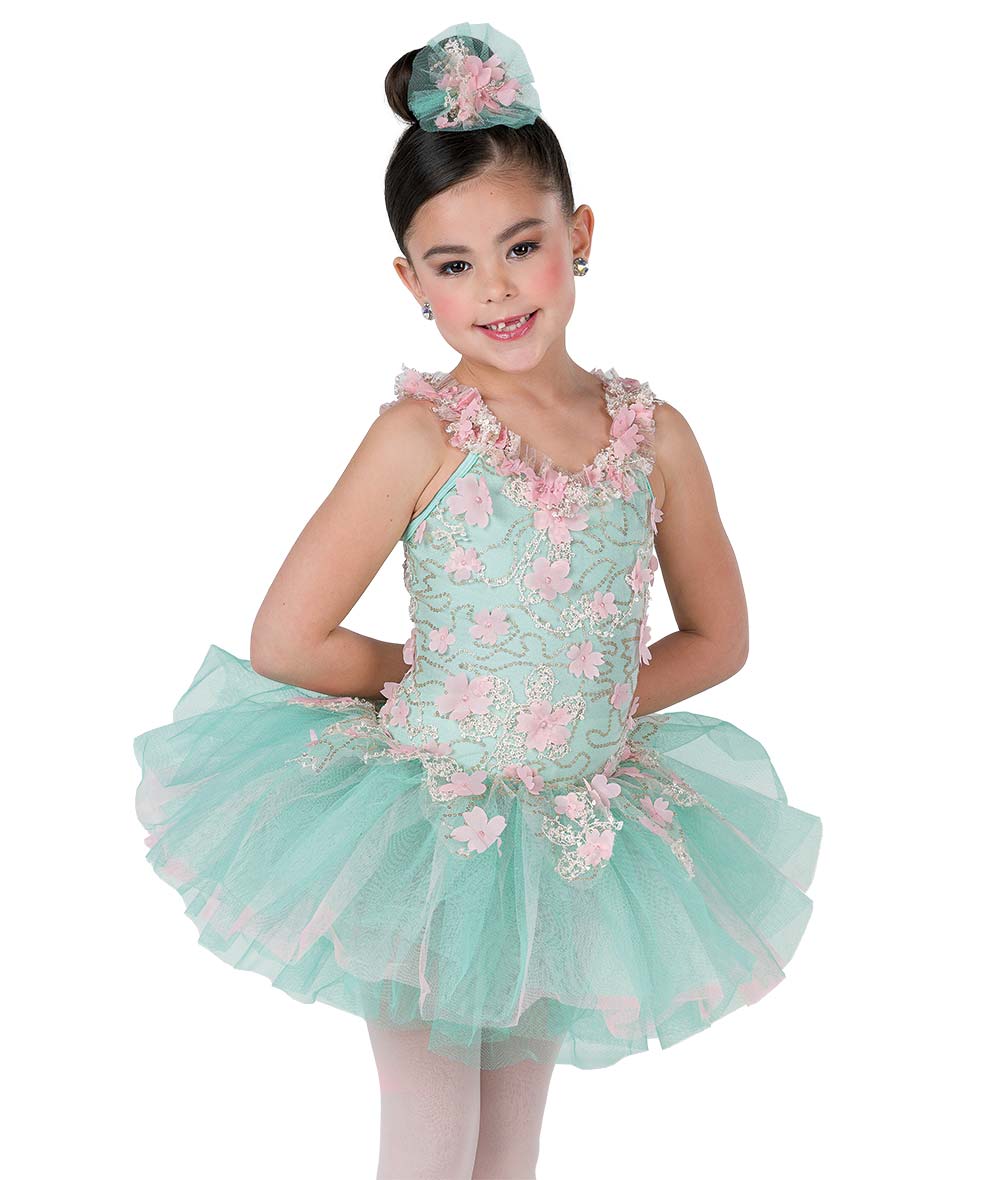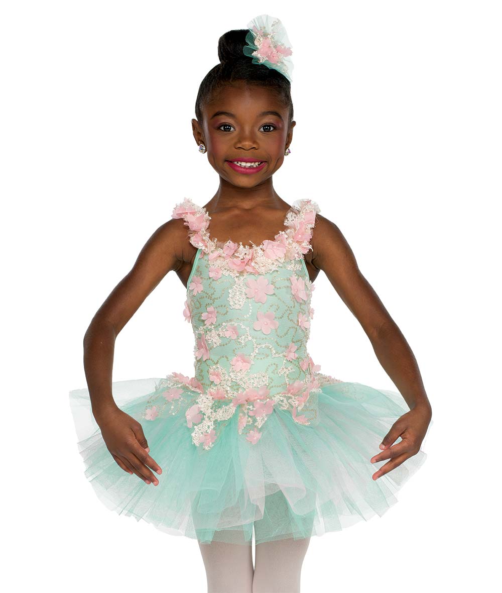 Lined embroidered floral mesh and spandex skirted leotard with attached floral trim. Attached tulle tutu. Imported.