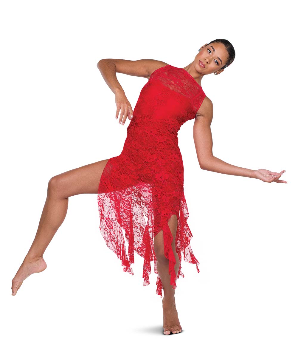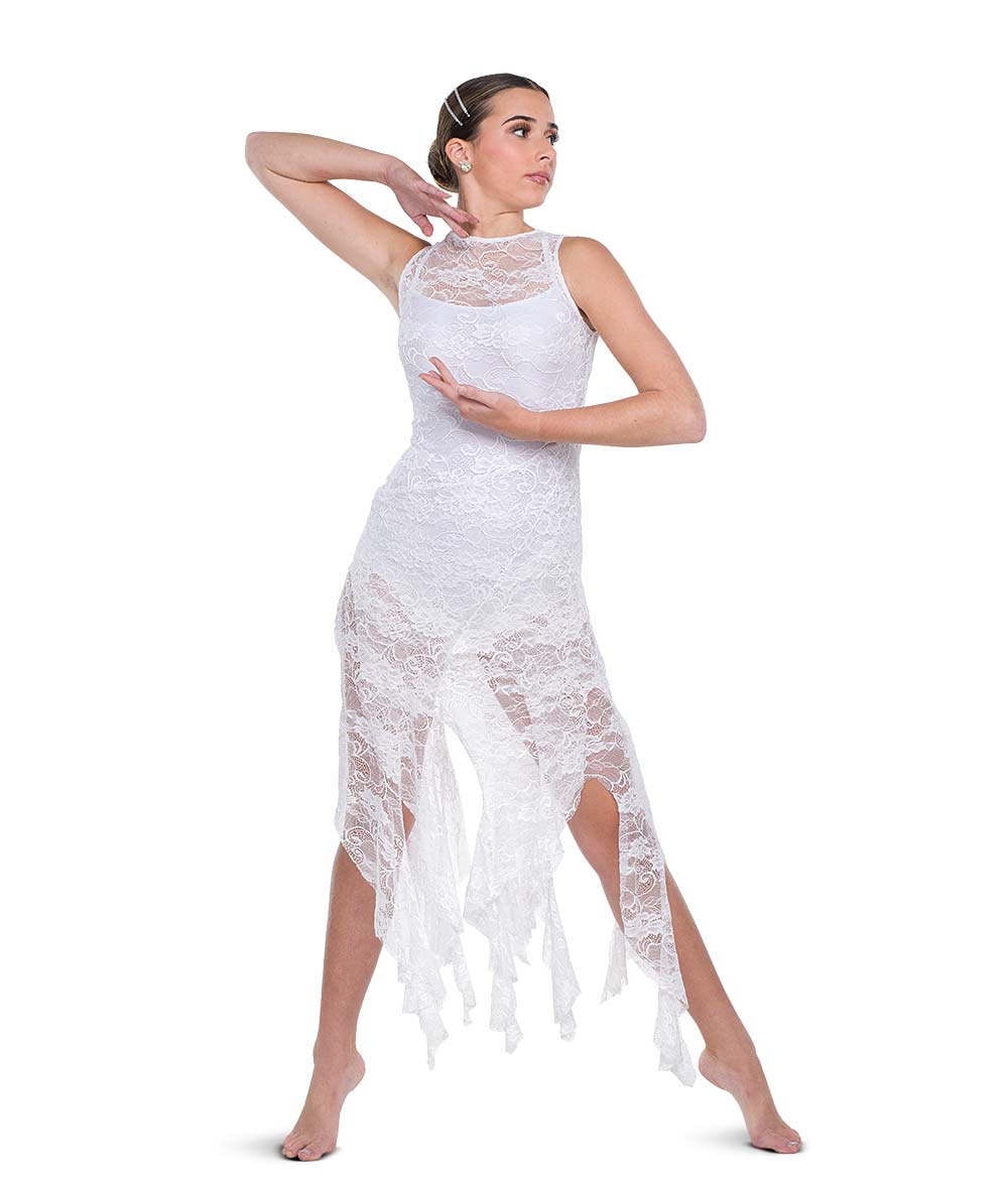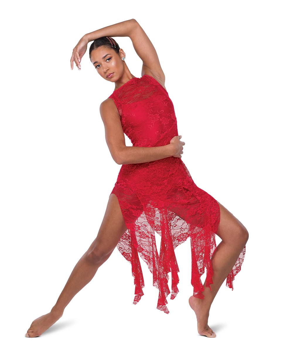 Floral lace dress with tattered skirt. Spandex leotard. Imported.