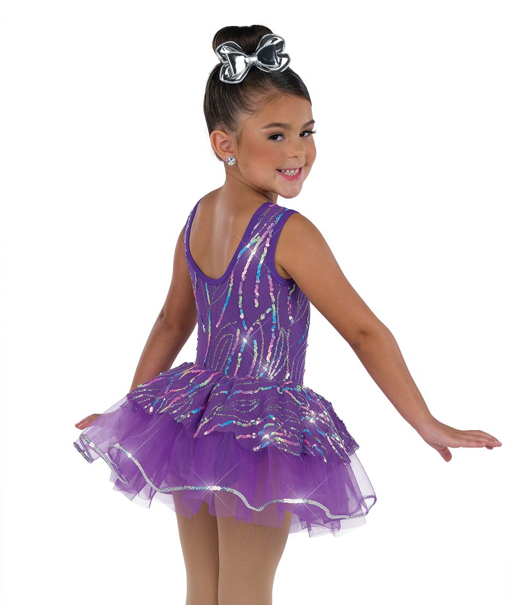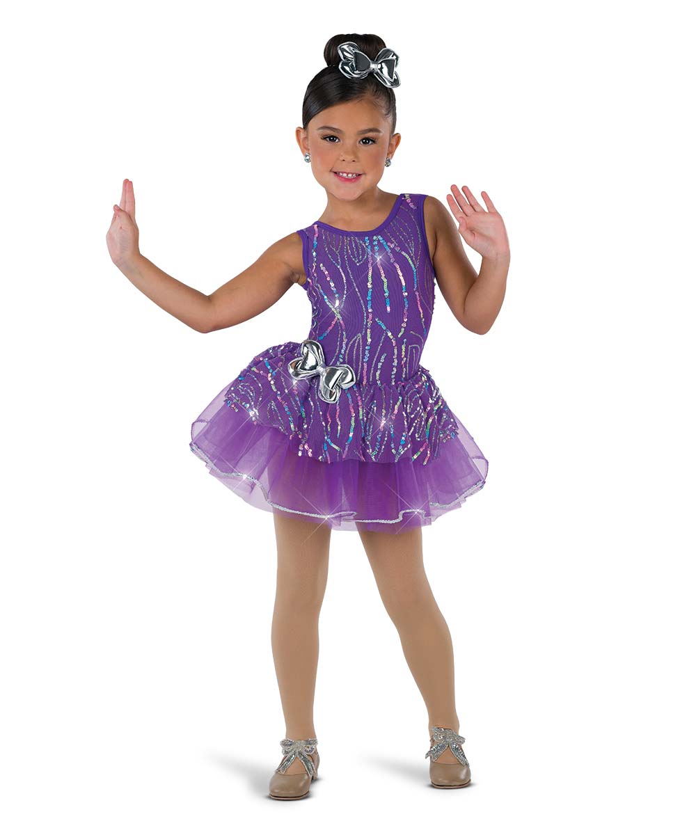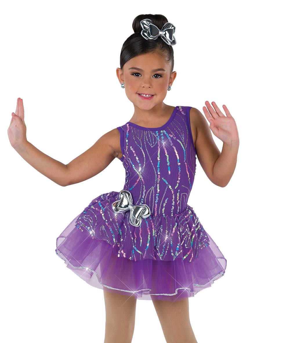 Lined iridescent sequin mesh dress over attached spandex leotard. Attached metallic bow and sequin trimmed organza skirt. Show bows sold separately. Imported.