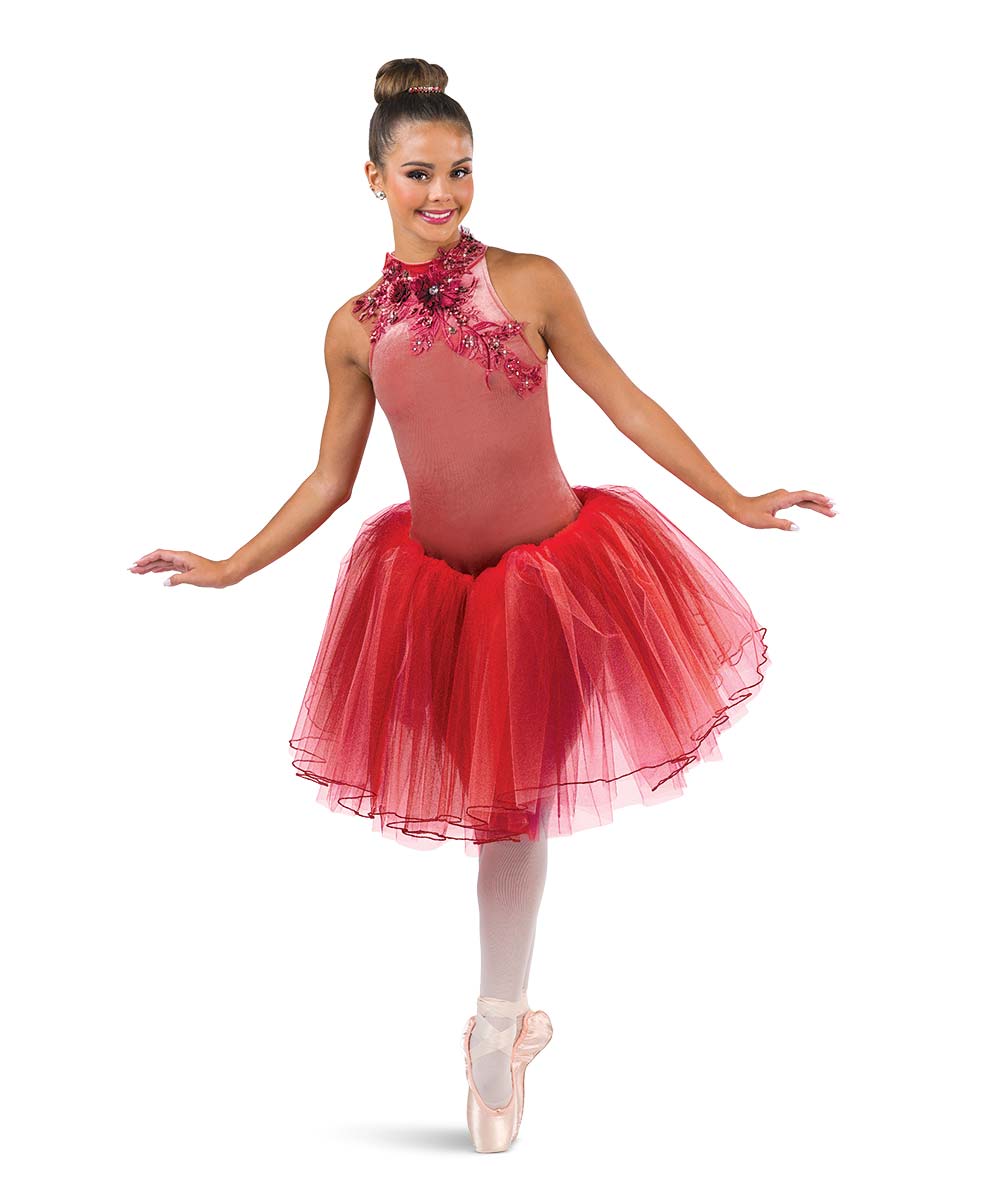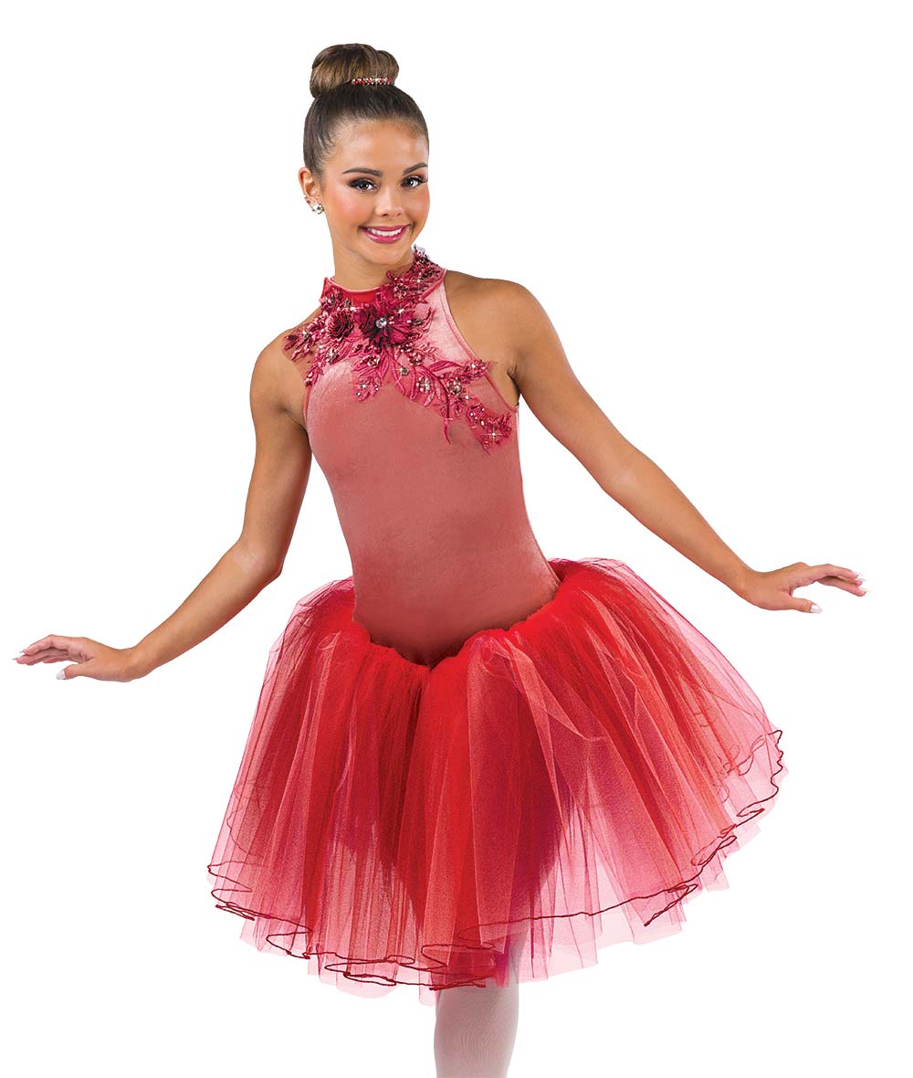 Velvet leotard with attached floral applique. Attached lettuce edge tulle tutu. Imported.