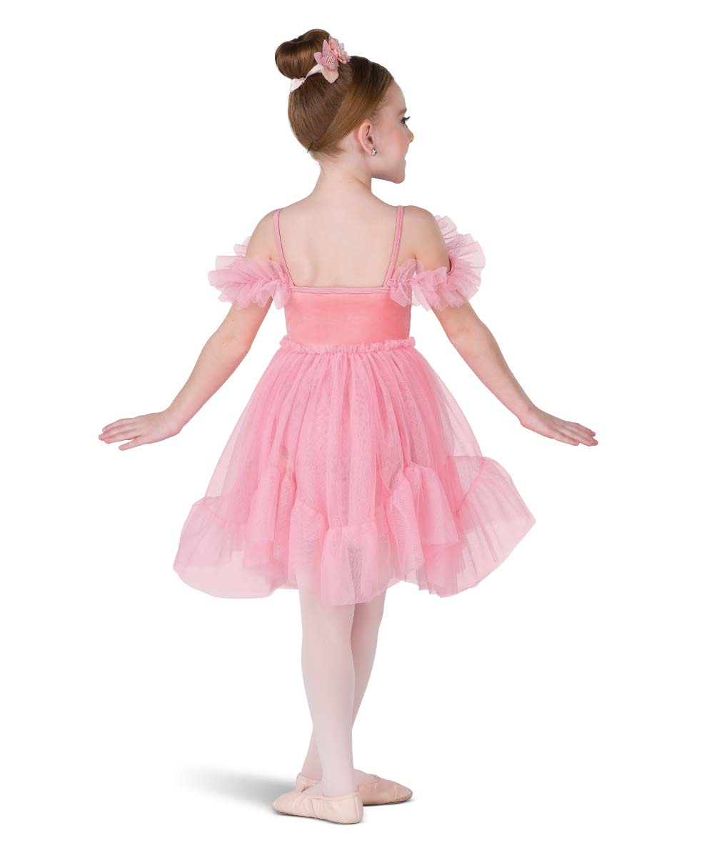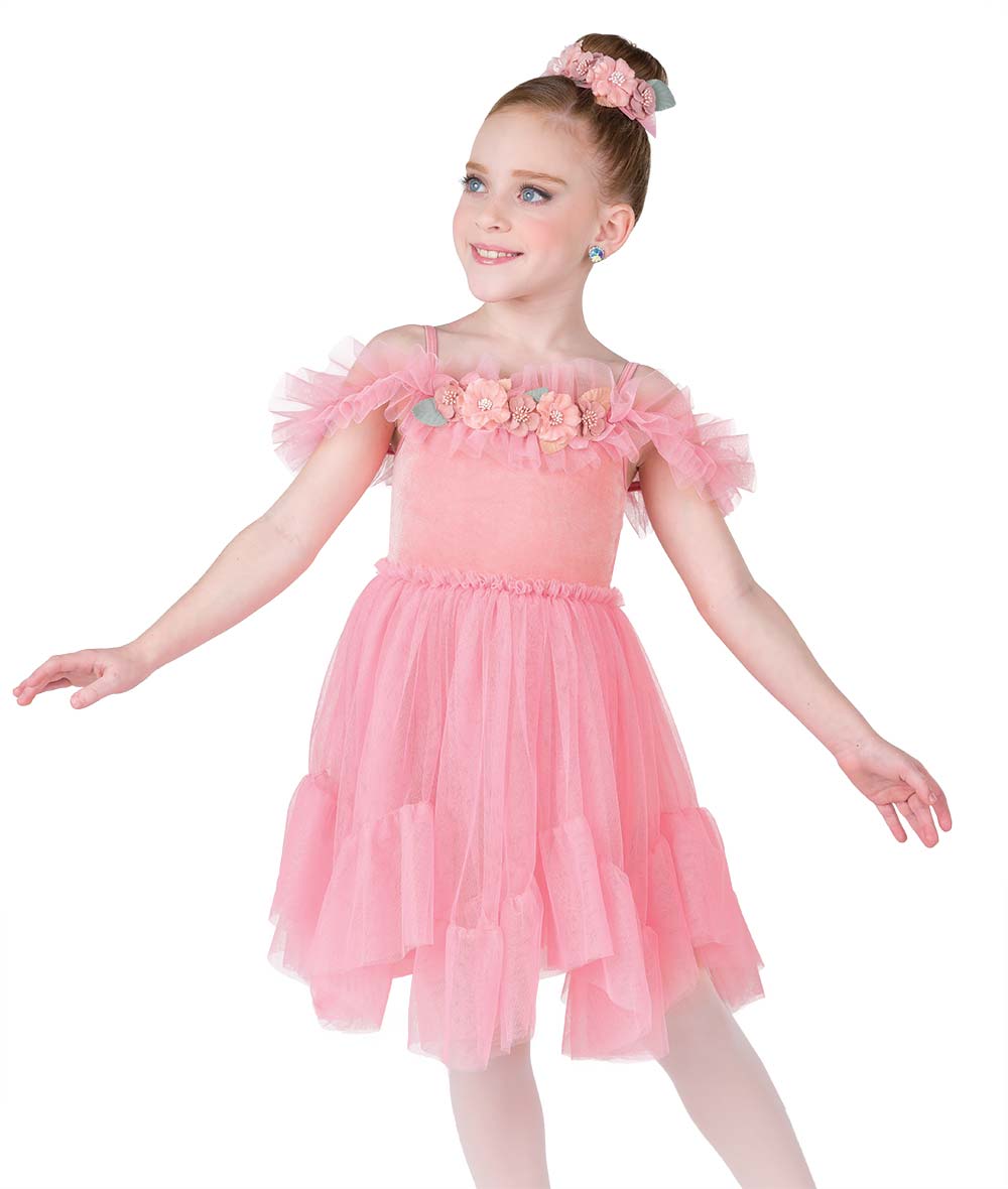 Velvet and mesh dress with ruffle sleeves over attached leotard. Attached flowers. Imported.