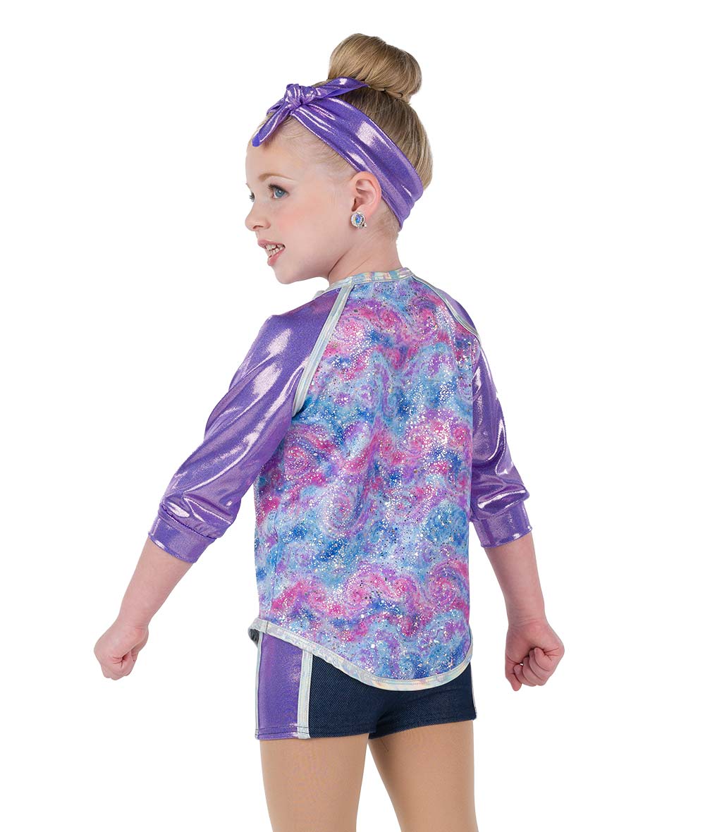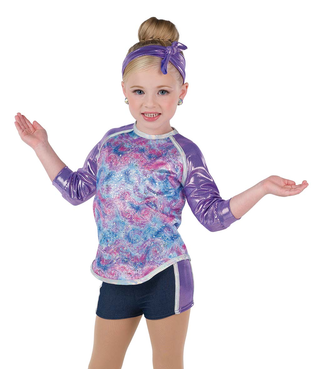 Foil tie-dye spandex and foil lycra top with three-quarter length sleeves. Denim hot pants with foil lycra side stripes. Made in the USA.