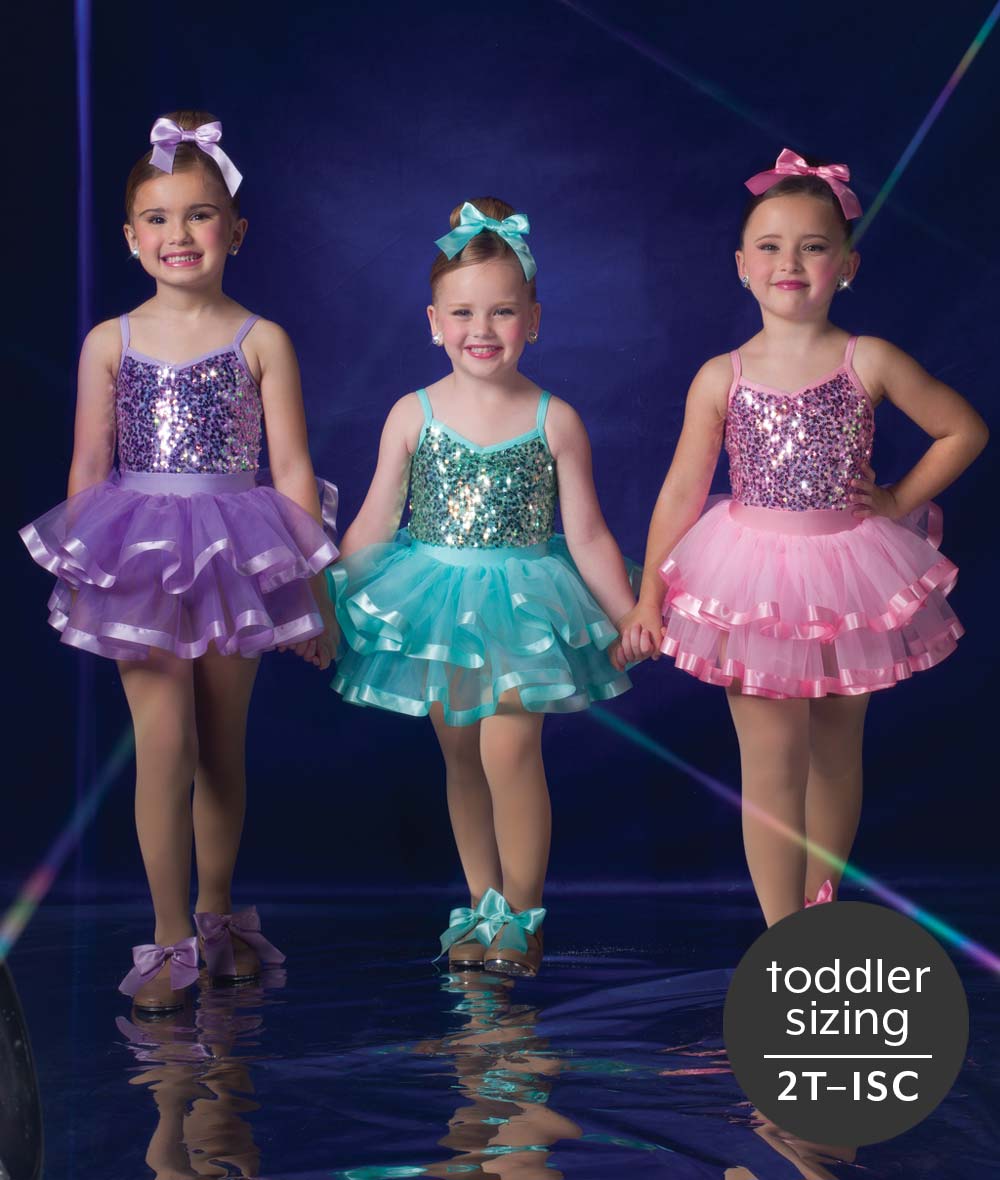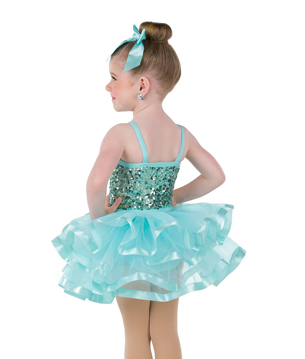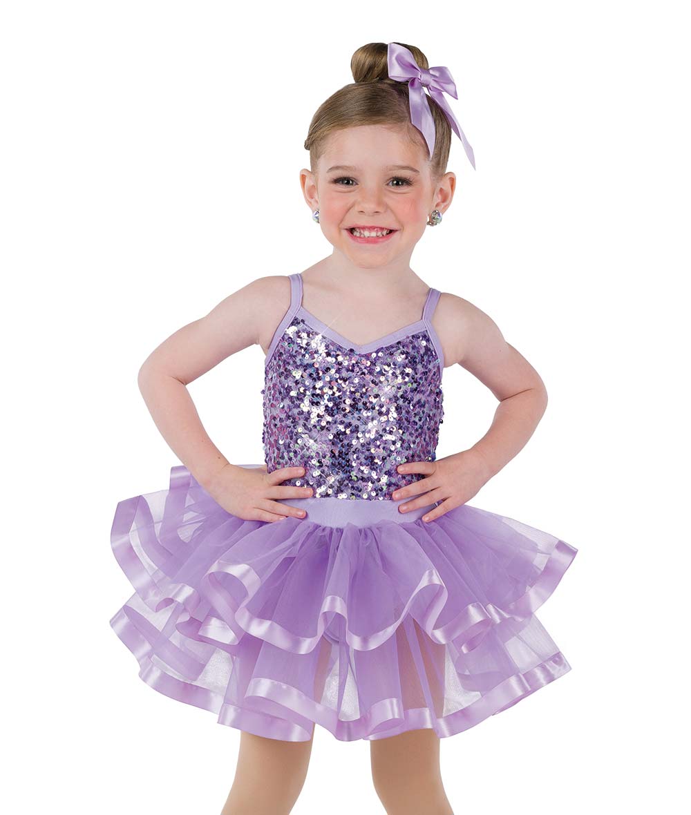 Lined small paillette sequin mesh and spandex leotard with attached ribbon trimmed organza tutu. Shoe bows sold separately. Made in the USA.