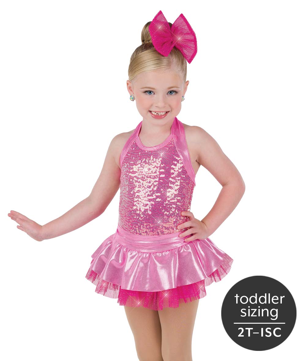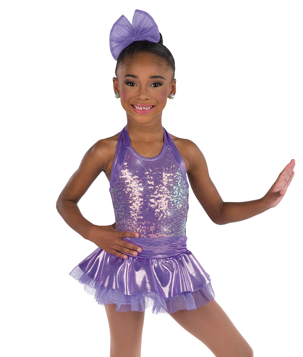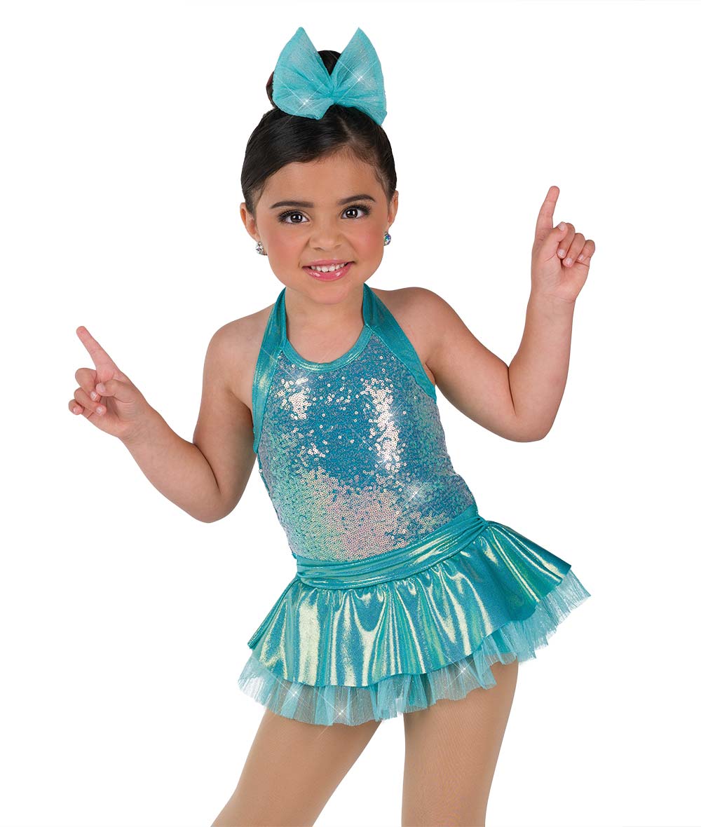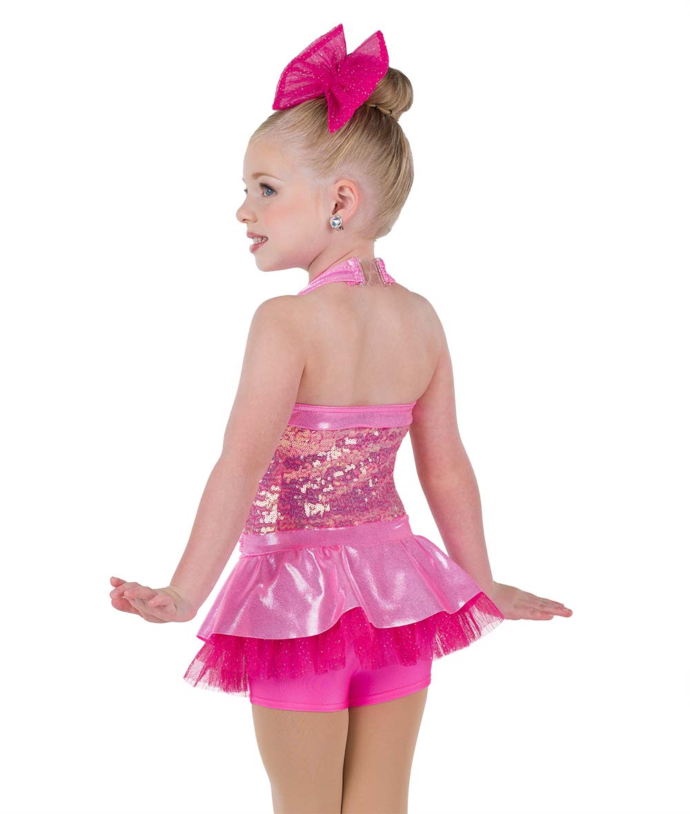 Lined mini sequin mesh, foil lycra and spandex skirted shortall with attached glitter pleated mesh crinoline. Made in the USA.