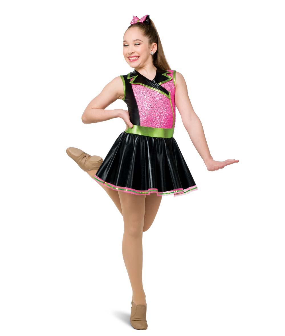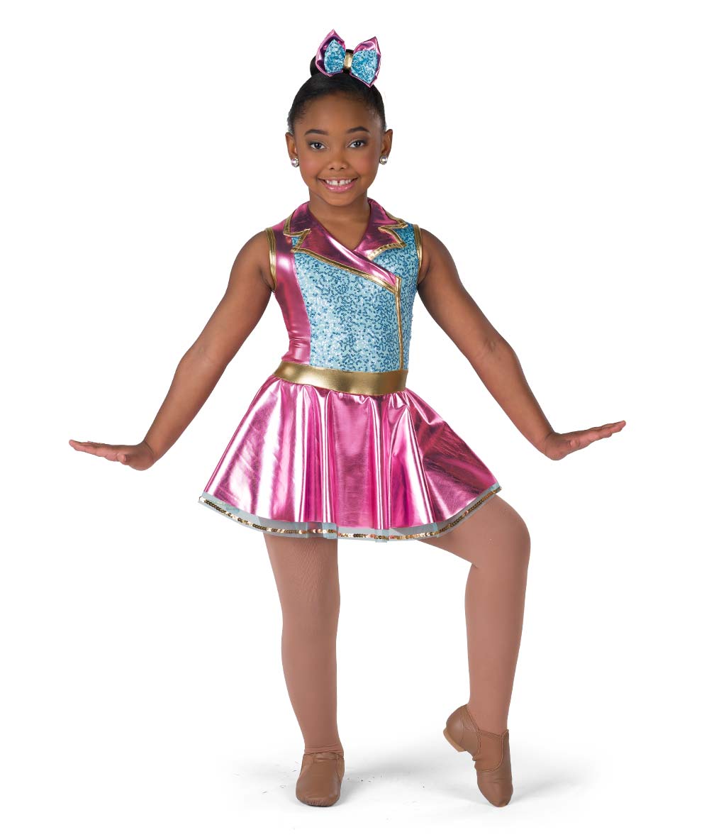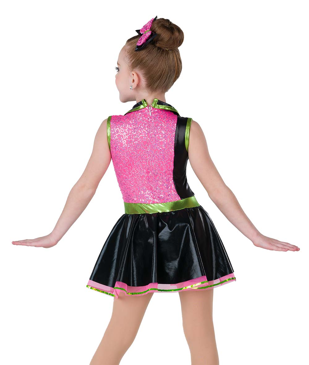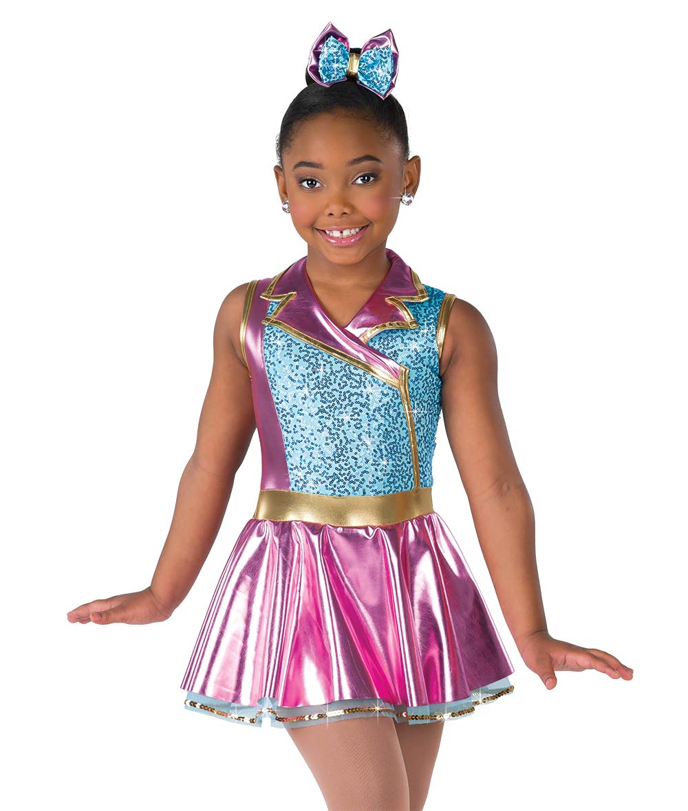 Lined sequin spandex and flat foil lycra collared dress over attached leotard. Attached sequin trimmed organza crinoline. Made in the USA.