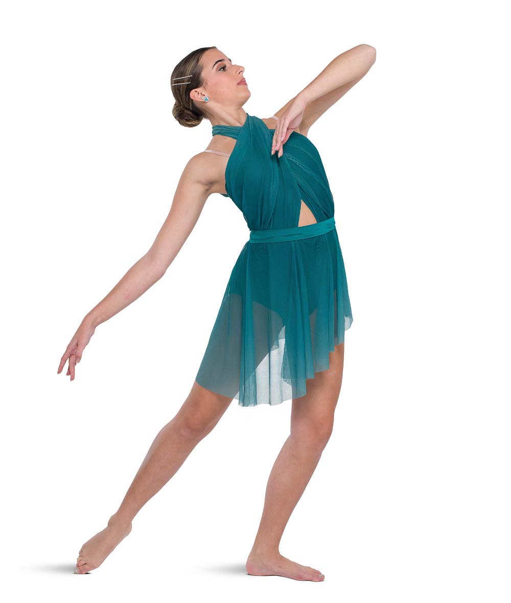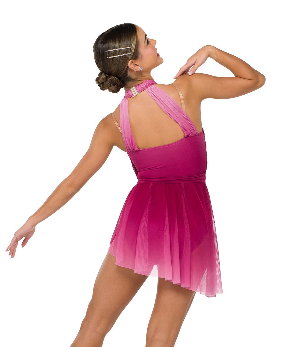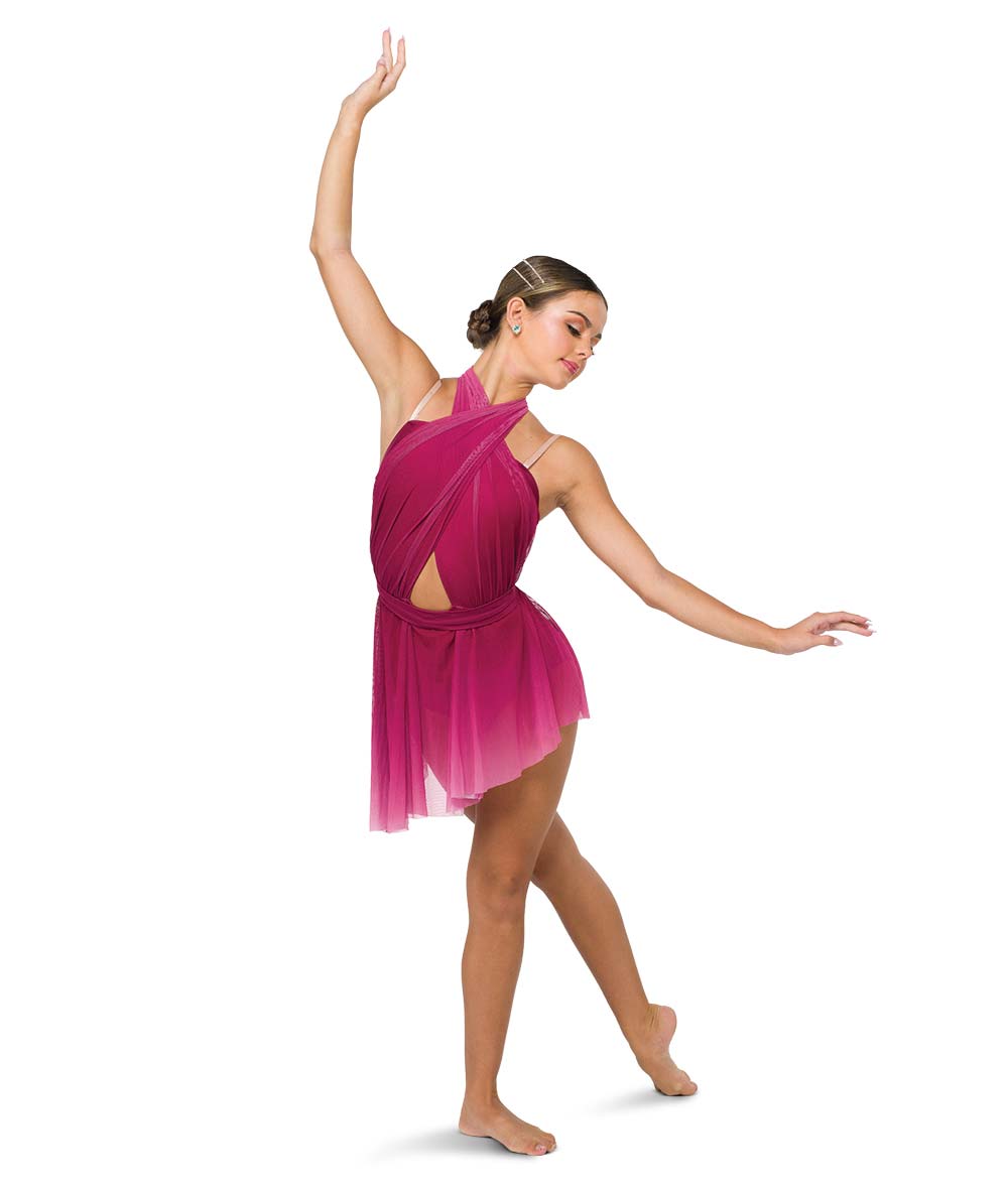 Lined ombre mesh dress with asymmetrical skirt over attached spandex leotard. Attached tan adjustable straps. Front midriff cutout. Imported.