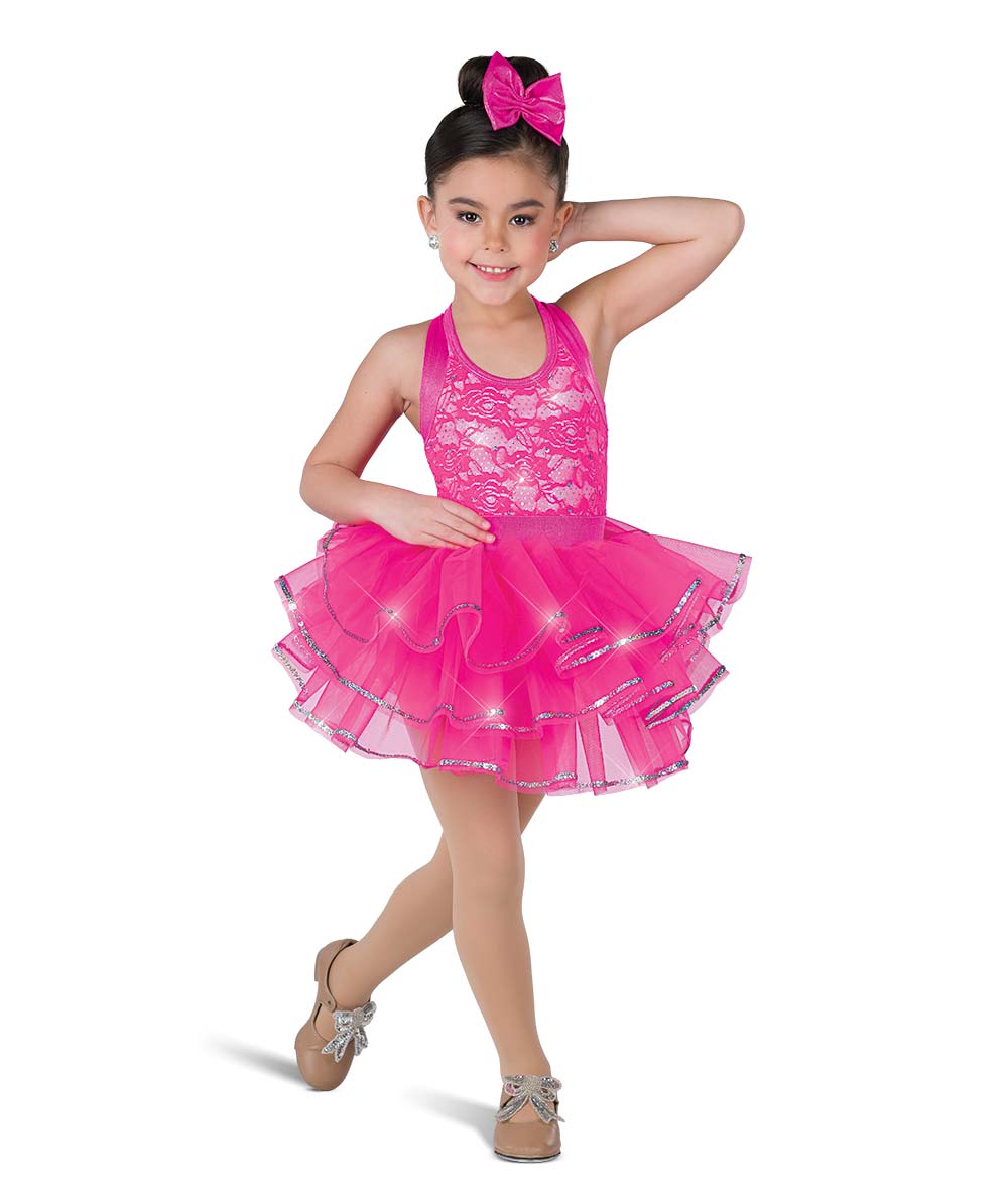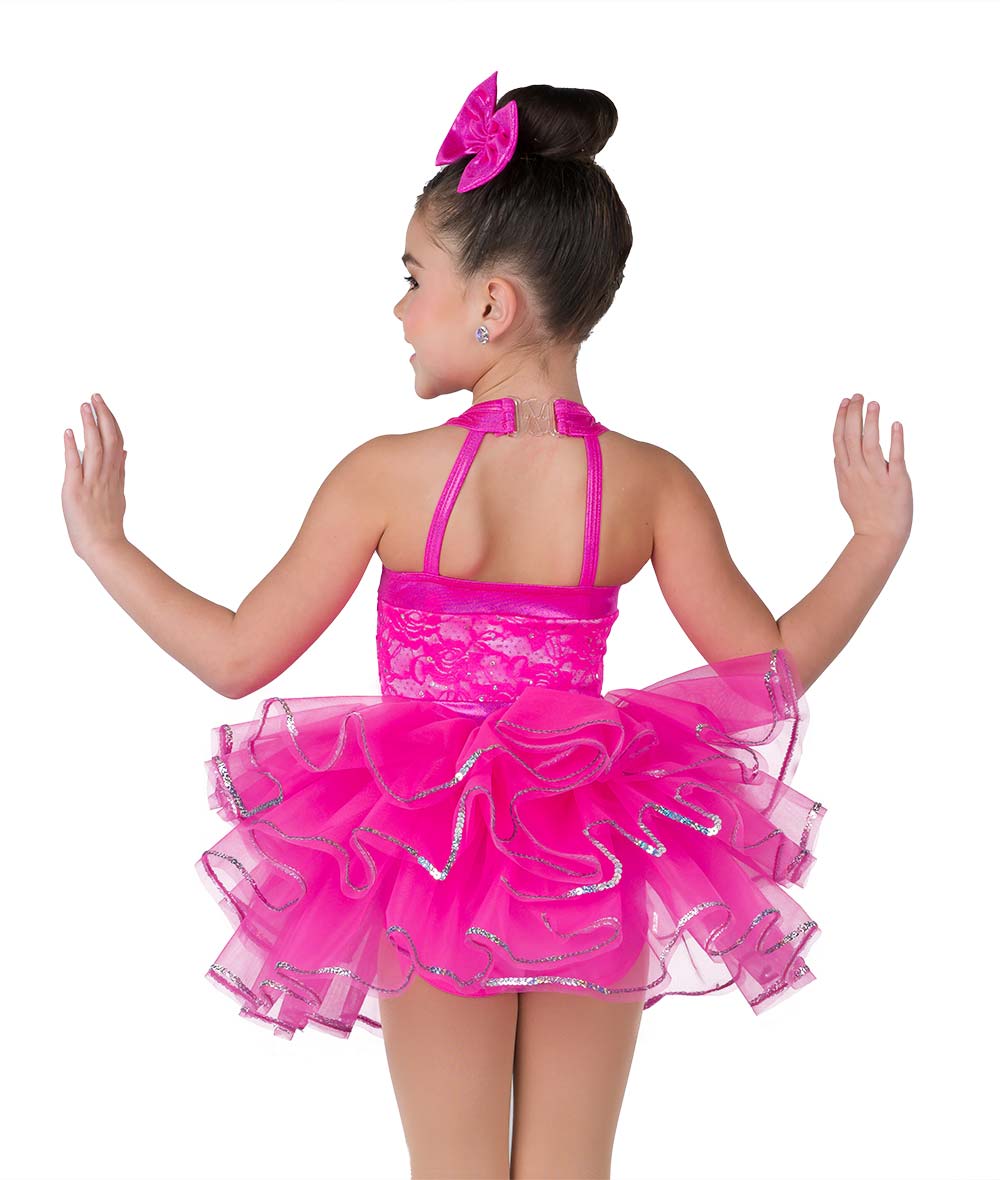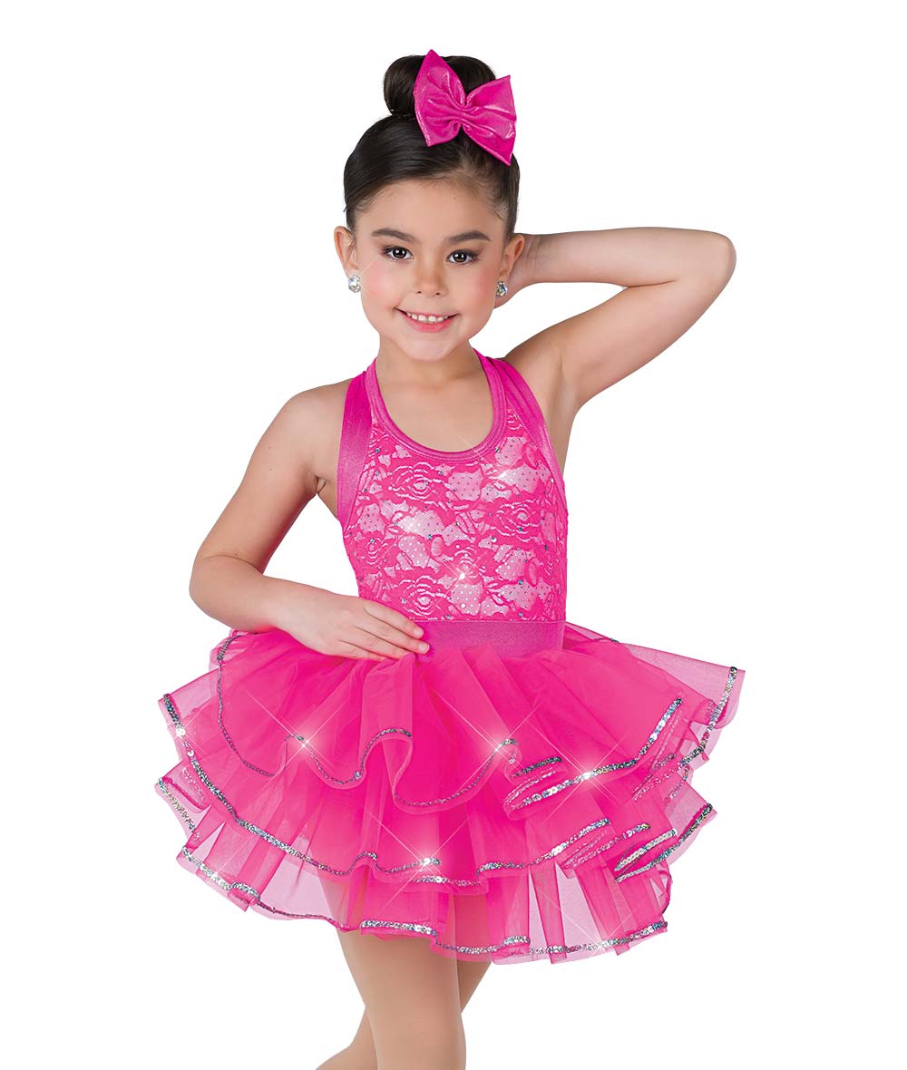 Lined sequin floral lace over sequin dot spandex leotard with foil lycra trim. Attached sequin trimmed organza tutu. Shoe bows sold separately. Made in the USA. Comfort Seamed. No-Itch Lining.