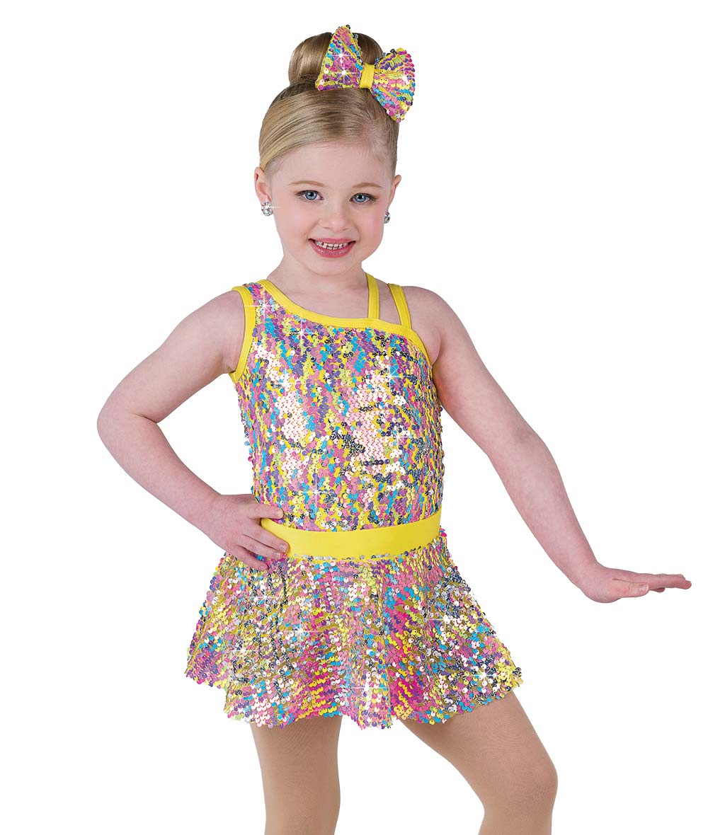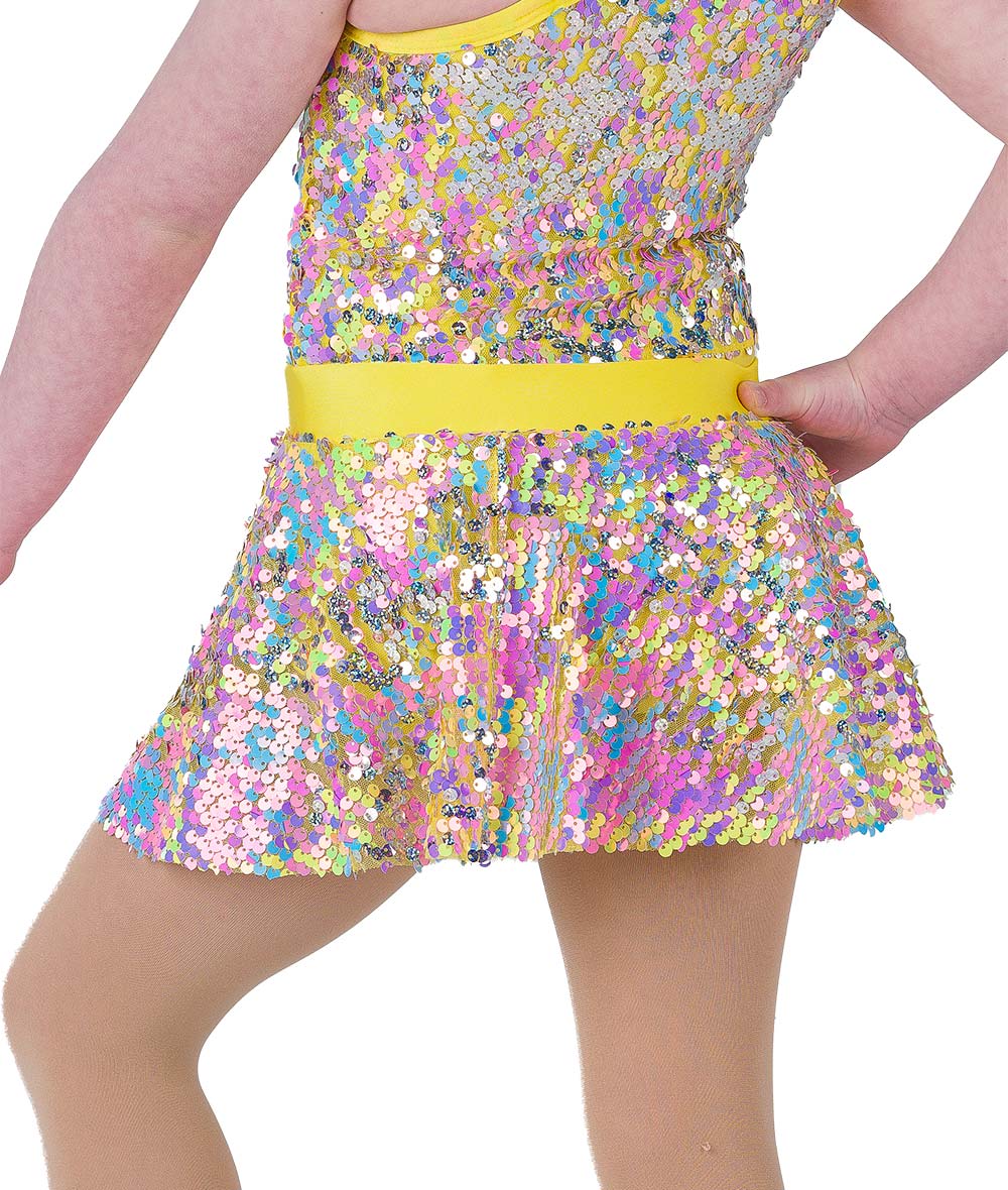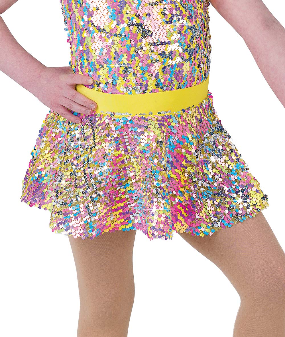 Rainbow flip sequin mesh skirt on spandex waistband. Made in the USA.