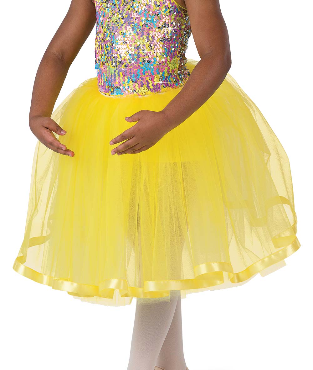 Ribbon trimmed tulle romantic-length tutu on elastic waistband. Made in the USA.