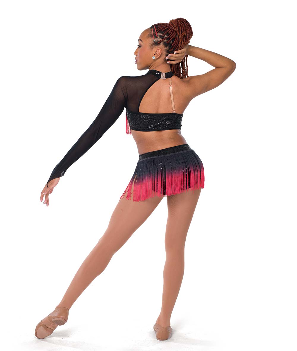Lined sequin and solid spandex leotard with cutouts and mesh sleeve. Attached ombre fringe skirt and trim. Imported.