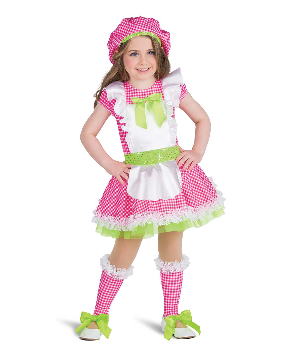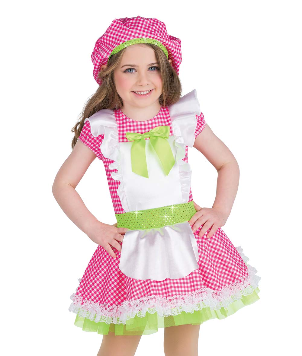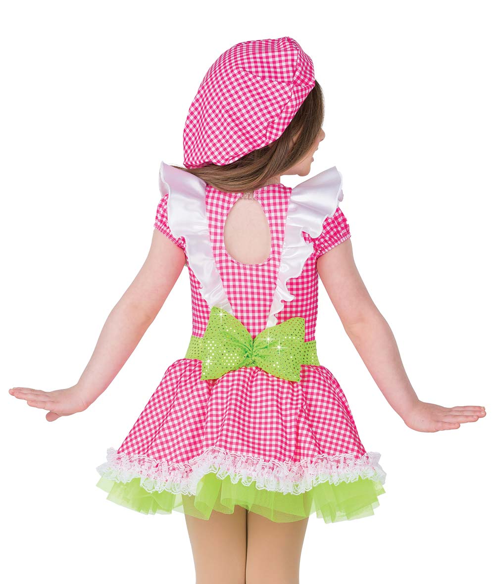 Gingham print spandex dress with attached stretch satin apron, sequin dot spandex waistband and lace ruffle trim. Attached organza crinoline over spandex leotard. Attached ribbon bow and stuffed back bow. Socks and shoe bows sold separately. Made in the USA.