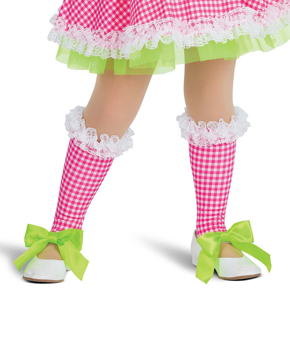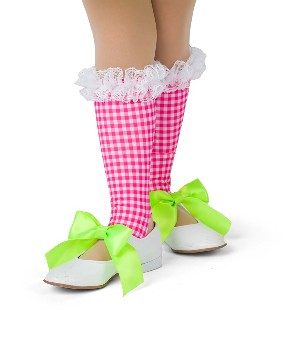 Gingham print spandex socks with lace ruffle trim. Made in the USA.
