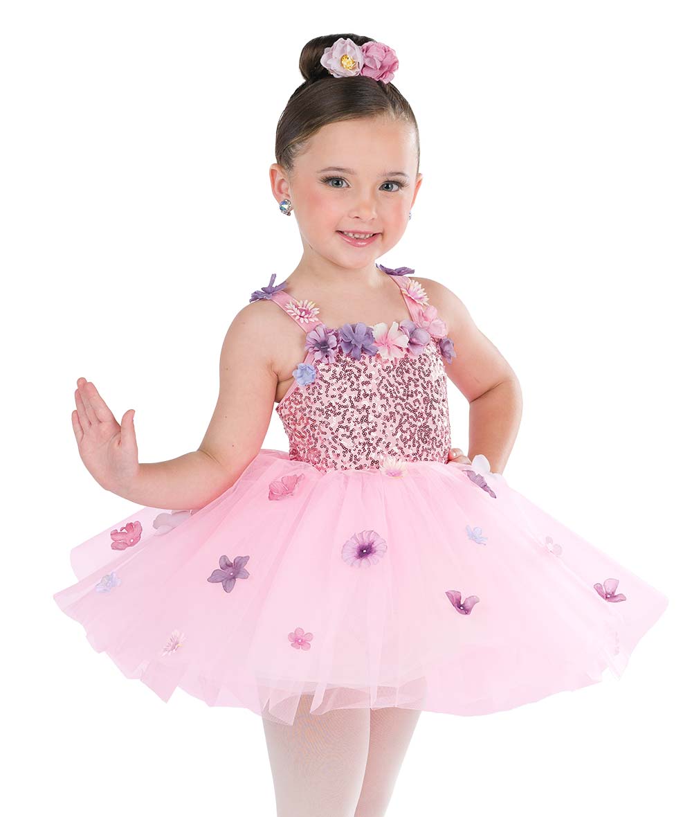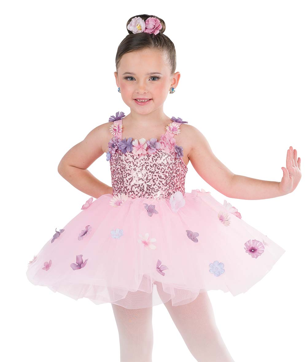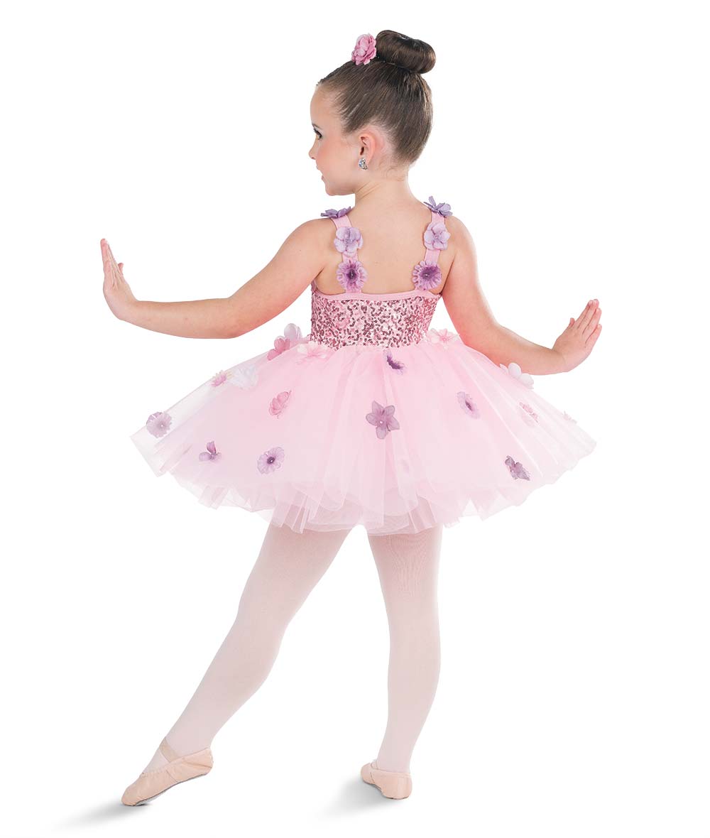 Attached lined sequin and solid spandex leotard with attached flowers and organza tutu. Imported.
