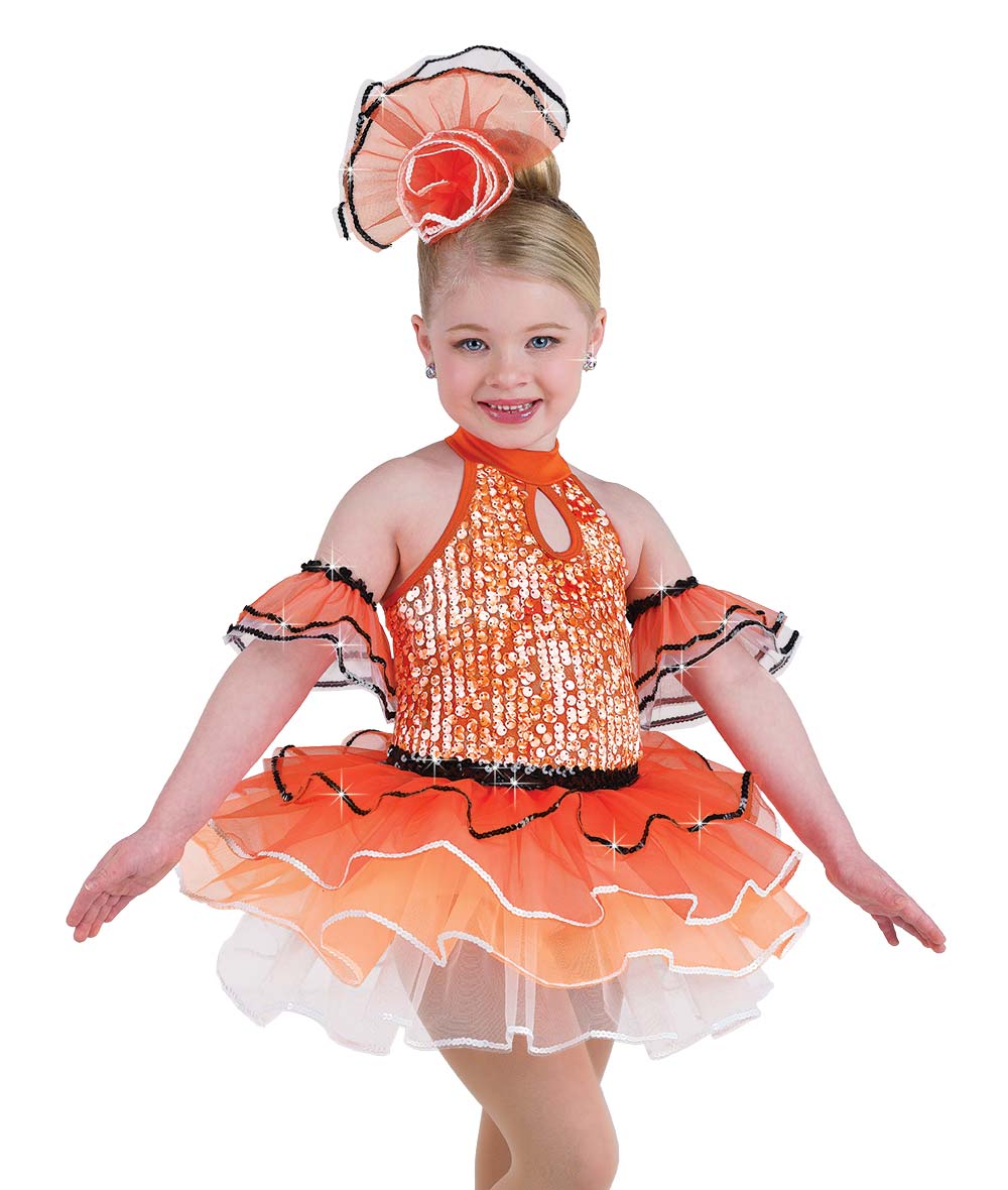 Sequin trimmed organza hair ruffle, arm ruffles, and topskirt. Made in the USA.
