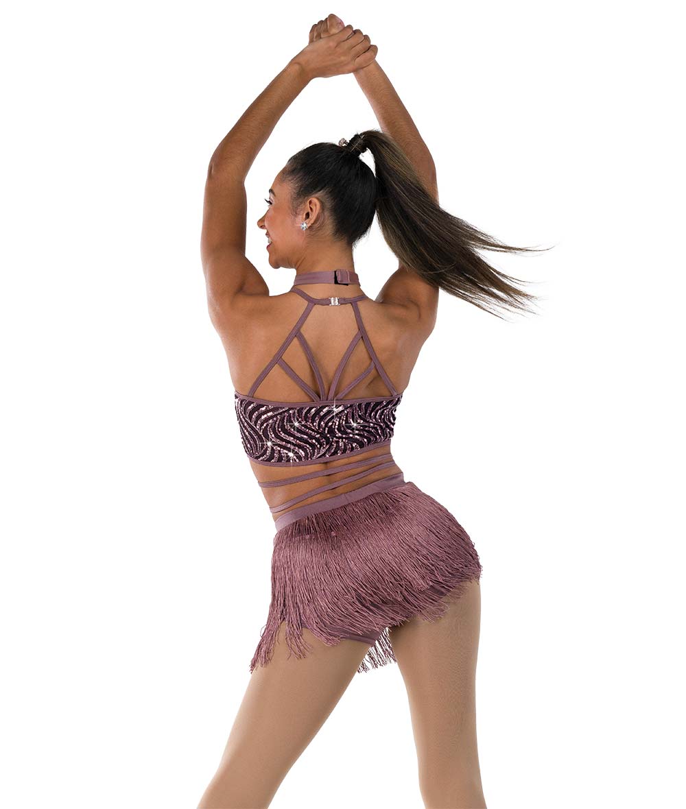 Lined wavy sequin and solid spandex leotard with cutouts. Attached fringe skirt. Imported.