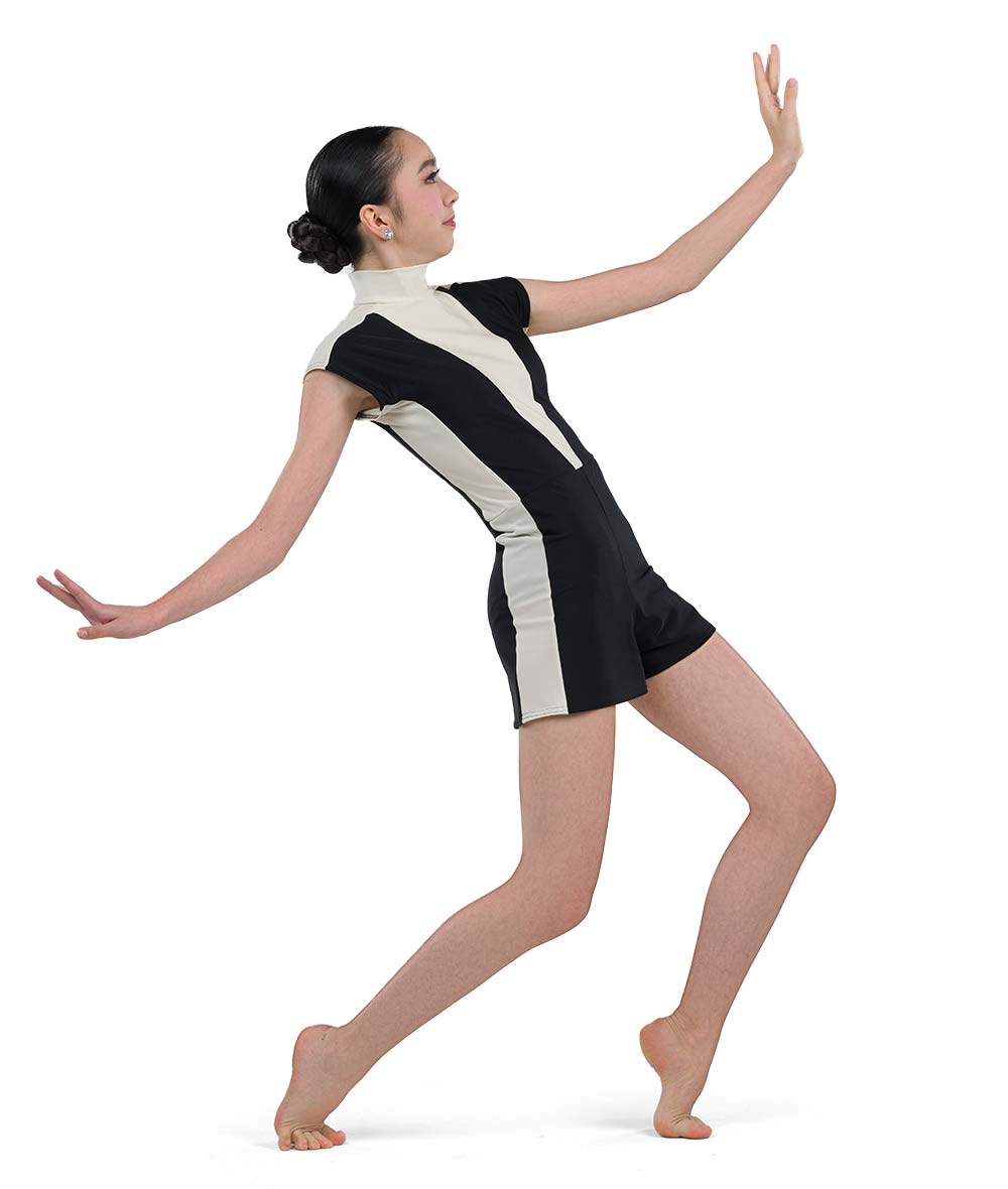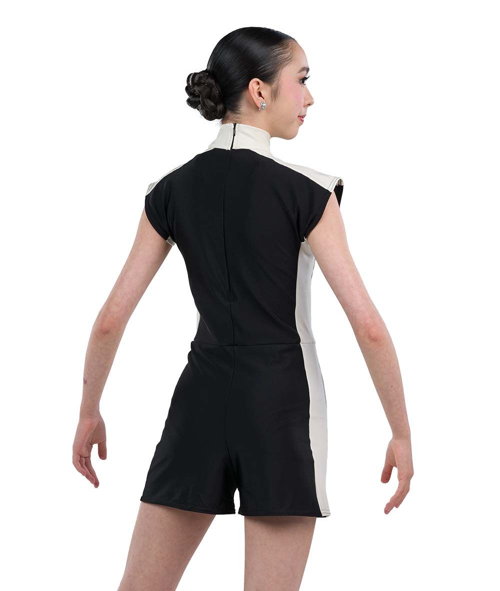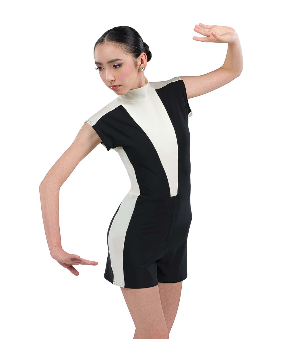 Spandex color blocked short sleeve shortall with built-in leotard. Zipper back. Made in the USA.