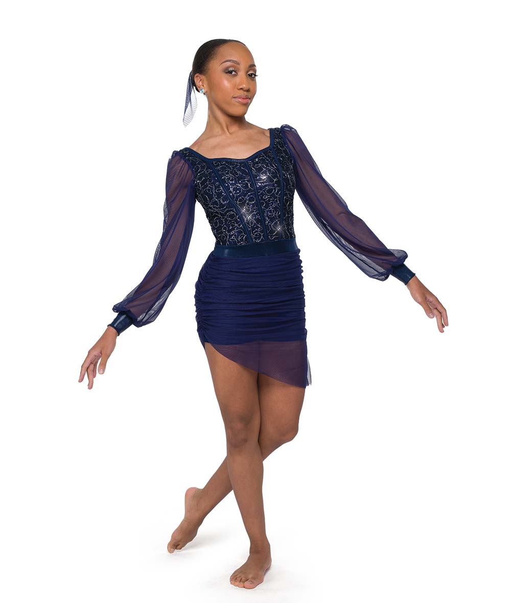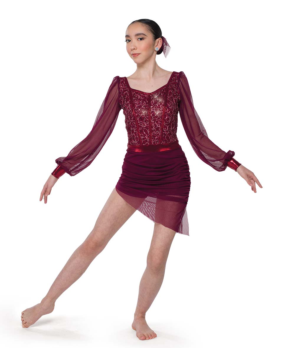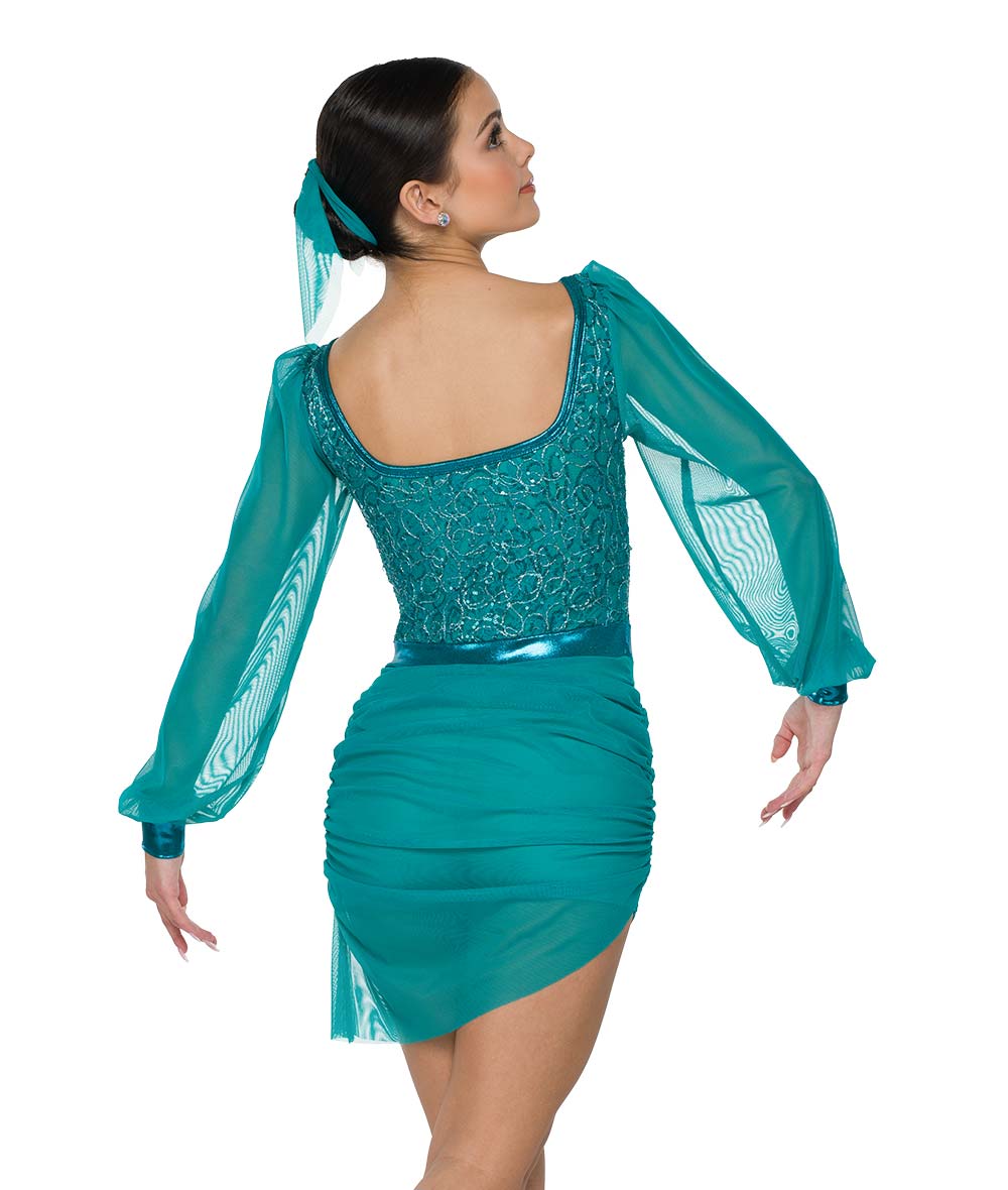 Lined sequin metallic lace and mesh long sleeve dress with foil lycra insets. Attached spandex hot pants. Unlined sleeves. Asymmetrical skirt. Made in the USA.