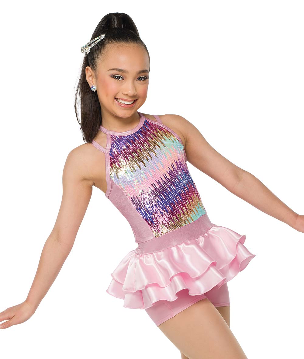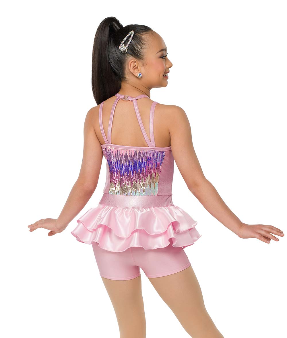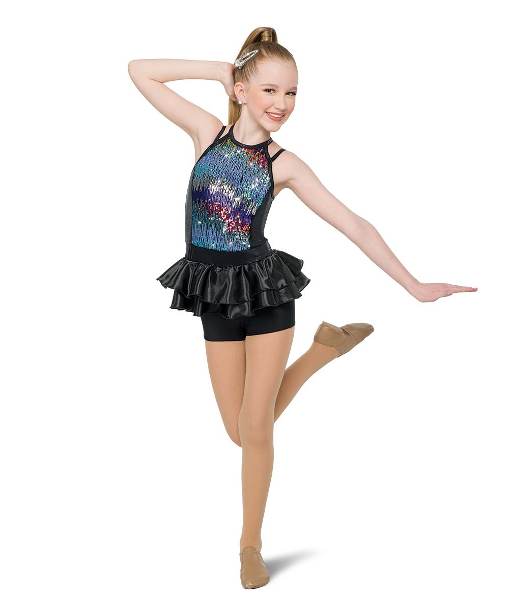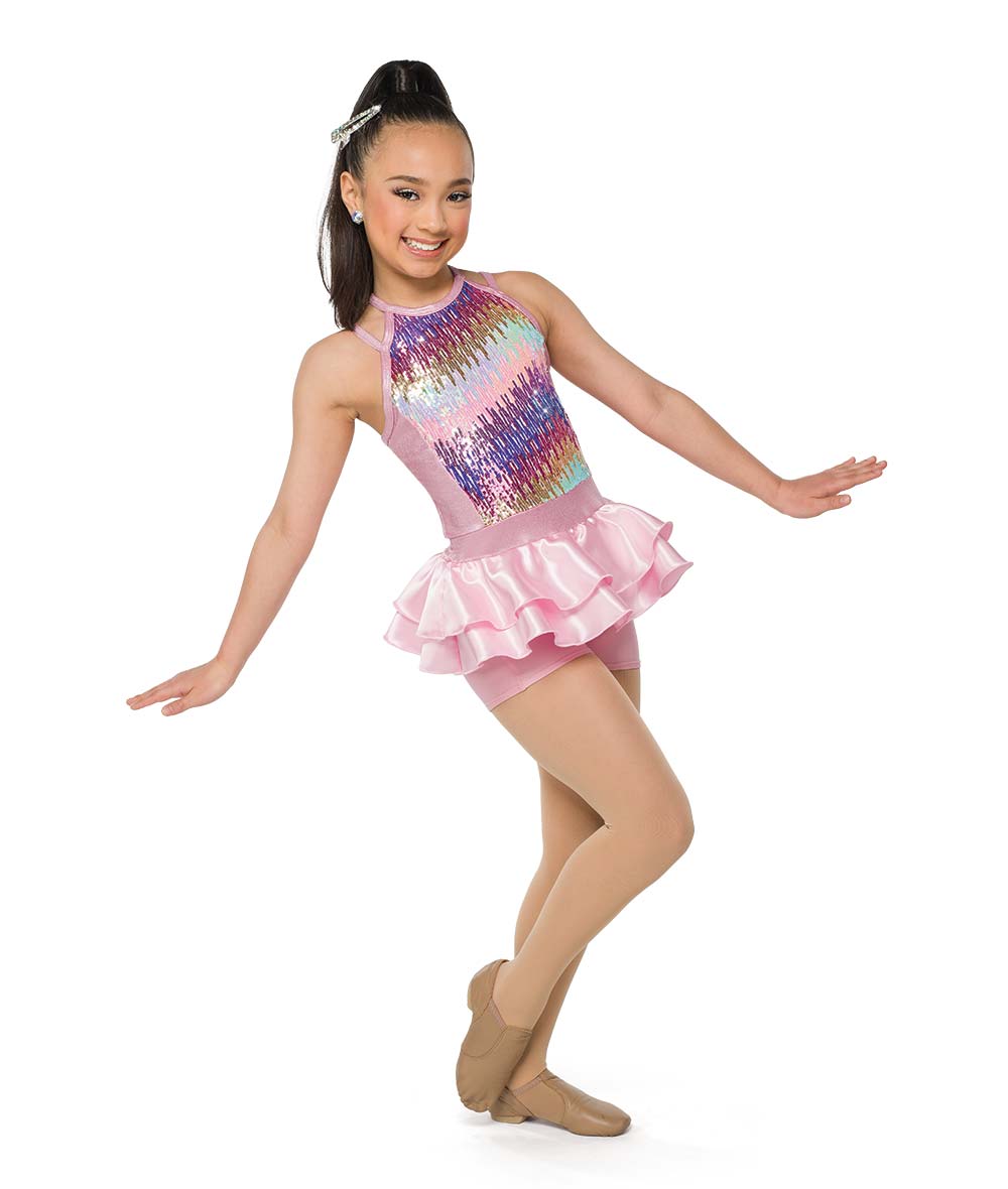 Lined ombre mini sequin mesh, foil lycra and spandex shortall with attached satin peplum. Ombre pattern may vary. Made in the USA.