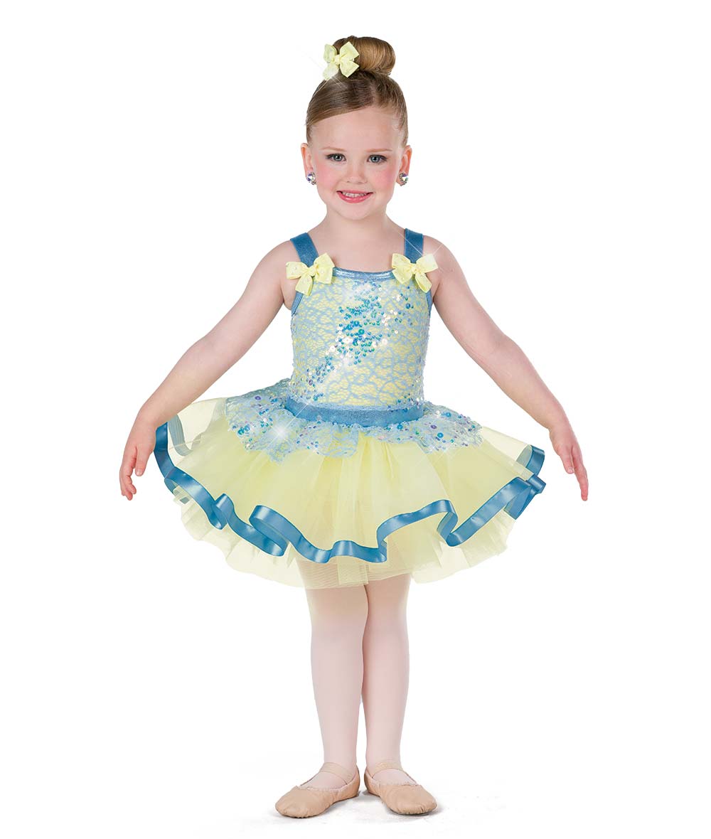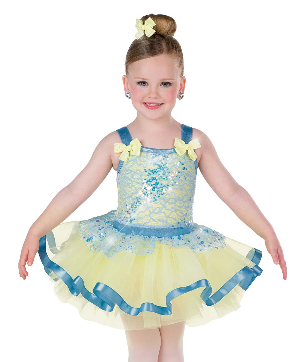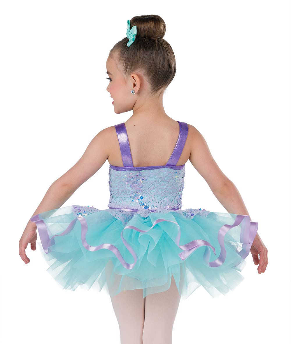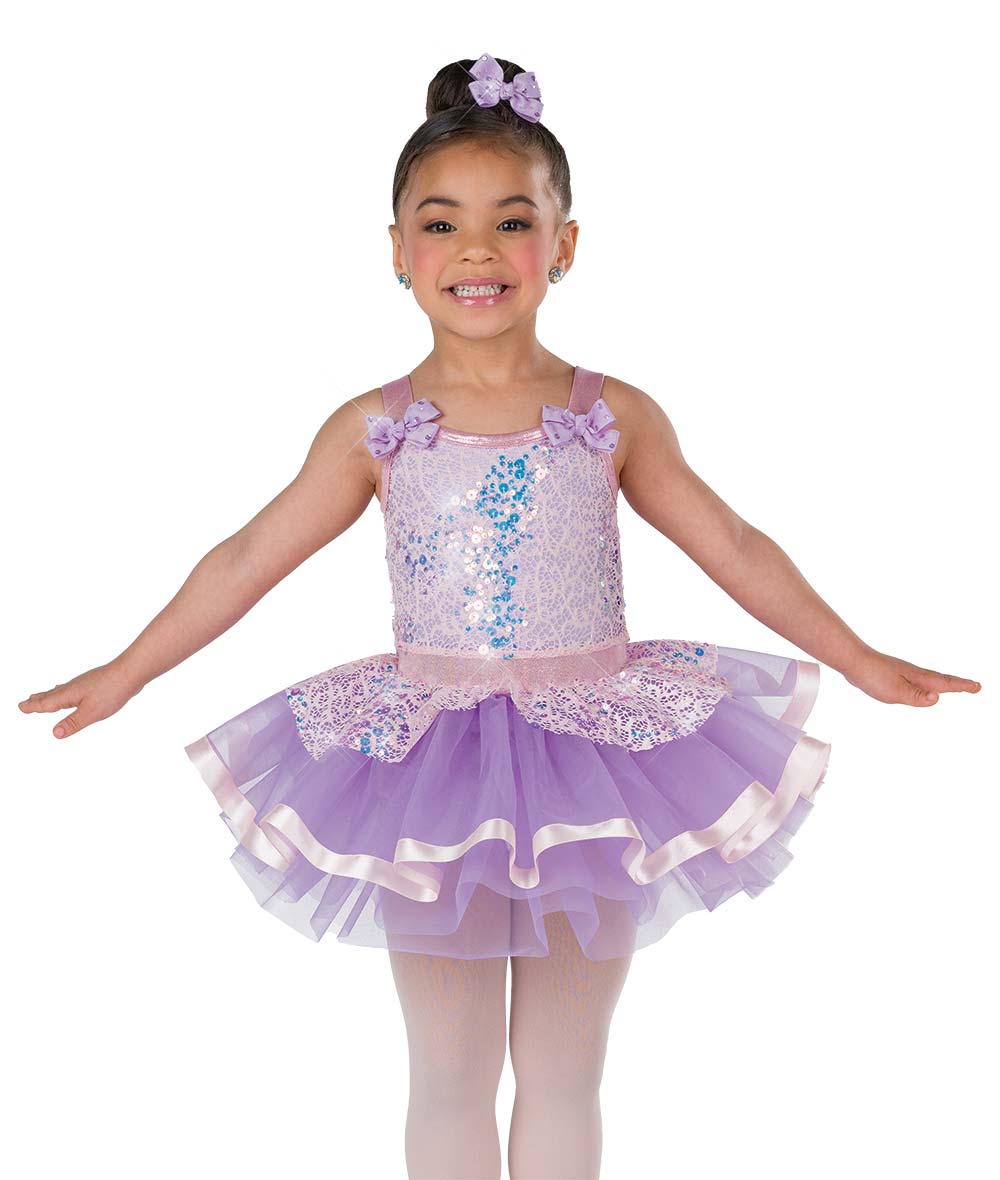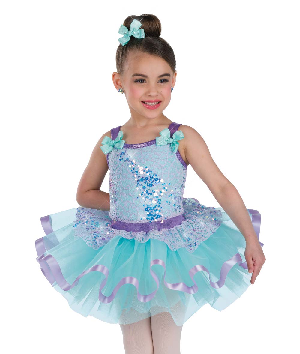 Lined scattered sequin lace and spandex skirted leotard with foil lycra trim and attached bows. Attached ribbon trimmed organza short tutu. Made in the USA.