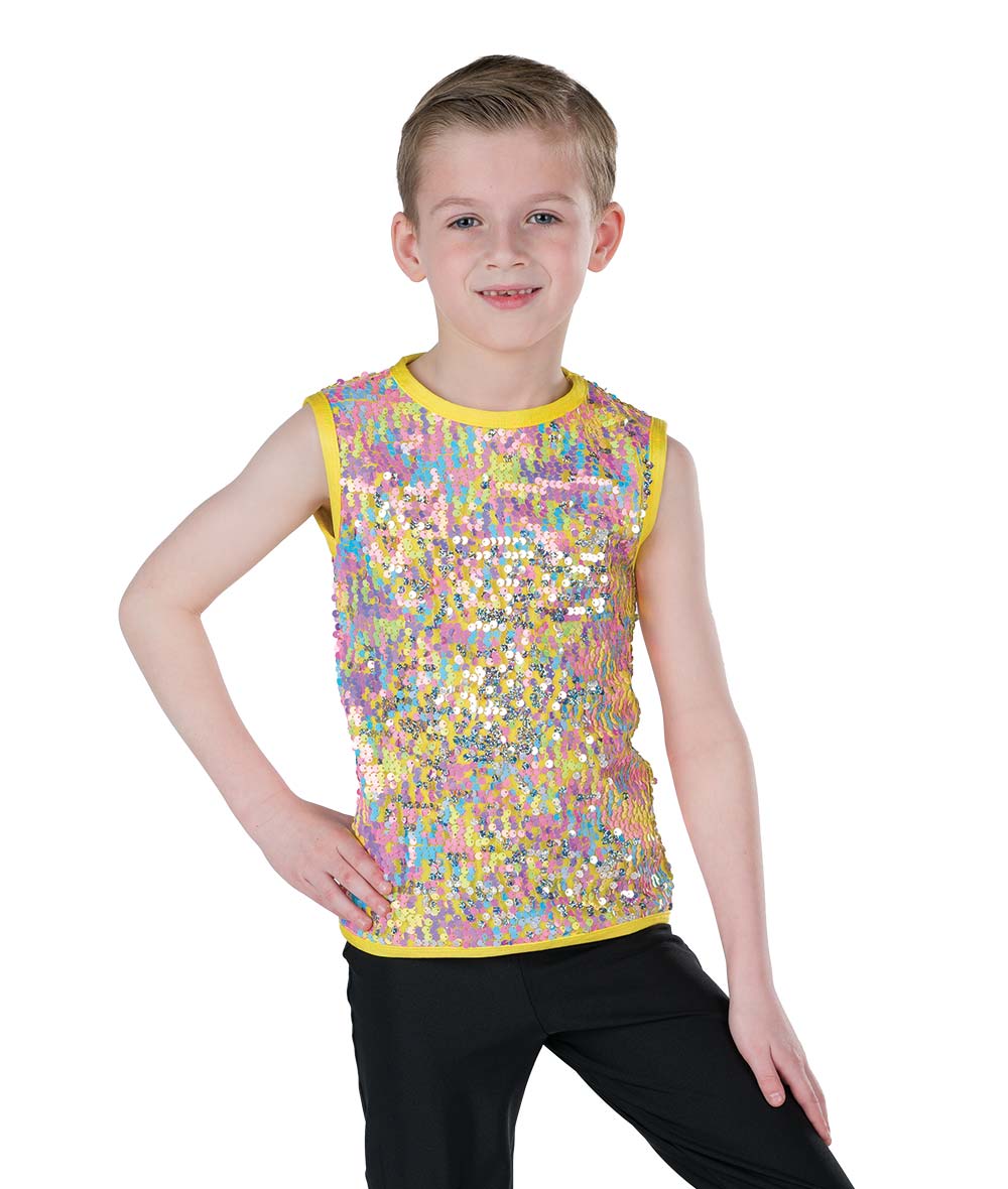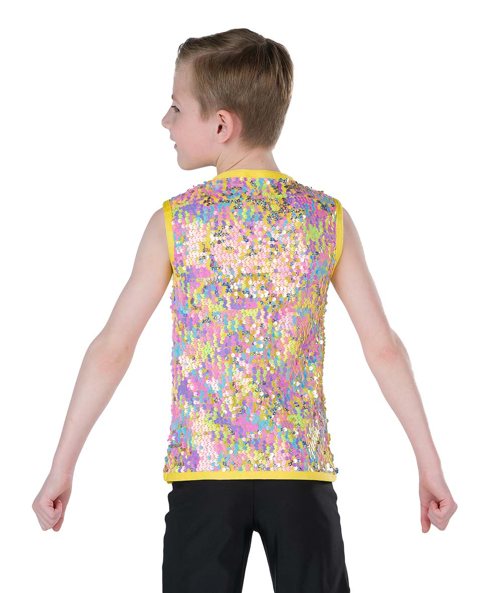 Lined rainbow flip sequin mesh and spandex tank top. Pants sold separately. Made in the USA.
