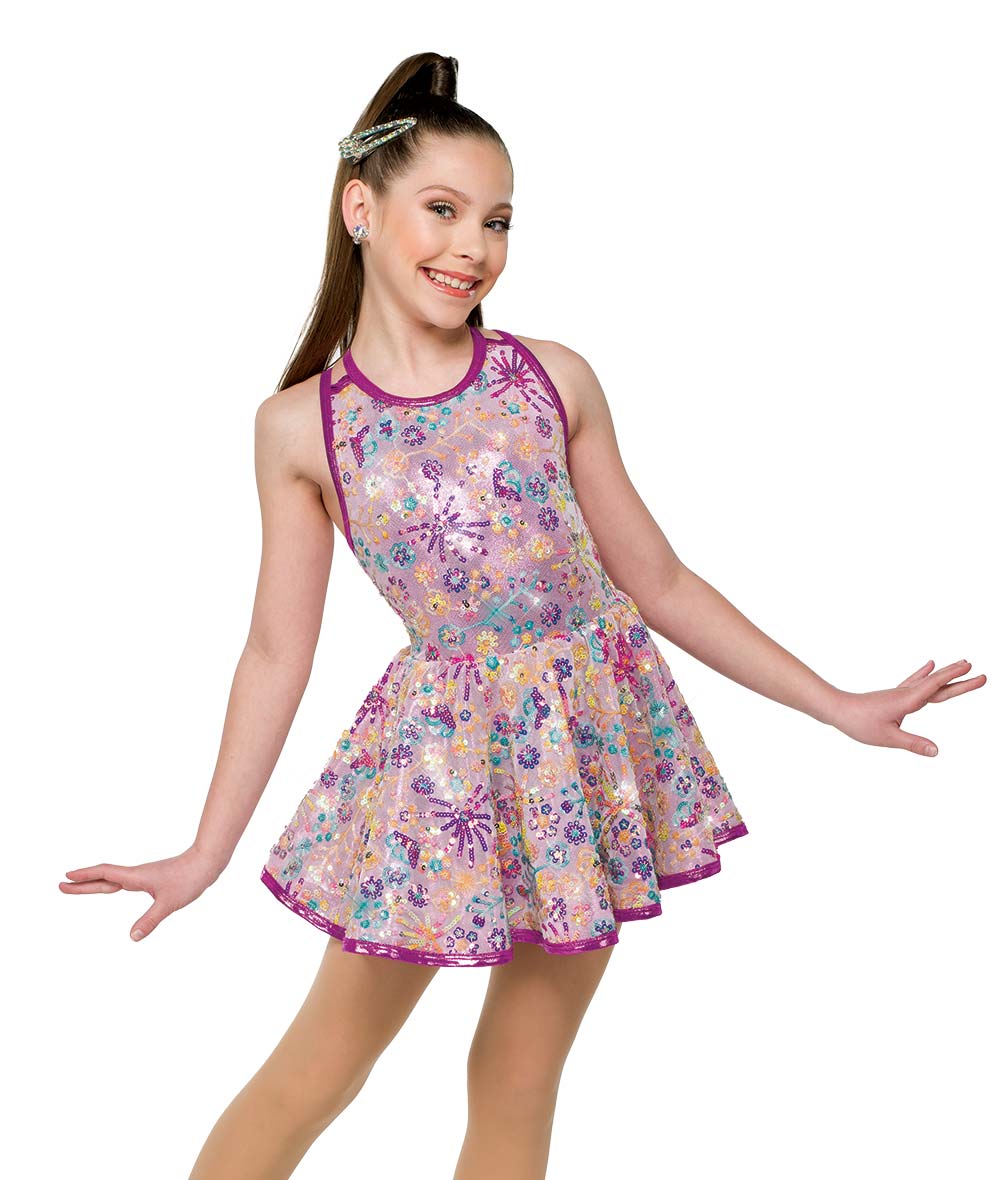 Lined multicolor floral sequin mesh and foil lycra dress over attached spandex hot pants. Made in the USA.