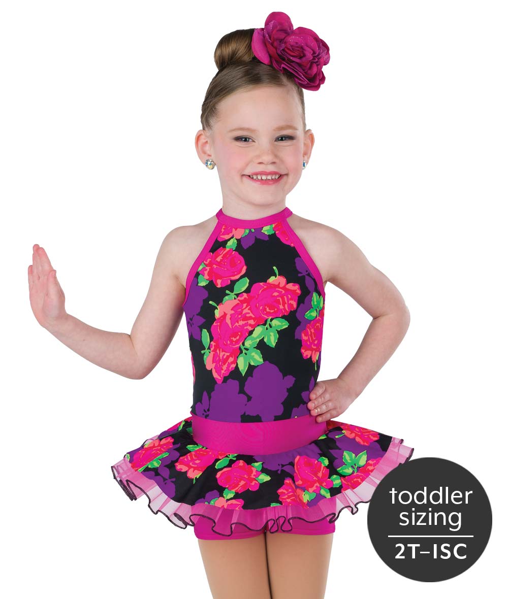Floral print and solid spandex skirted shortall with attached lettuce edged organza tutu. Made in the USA.