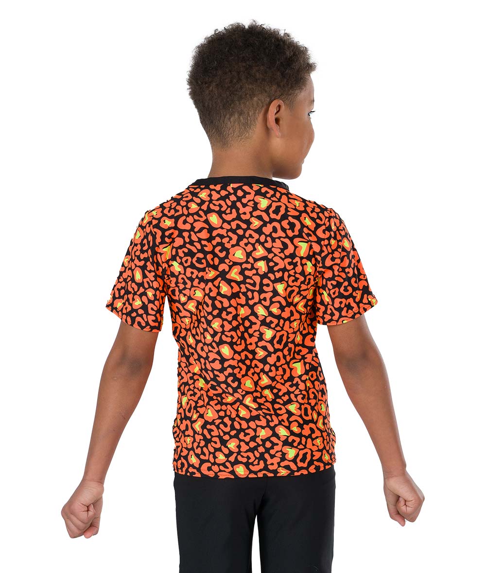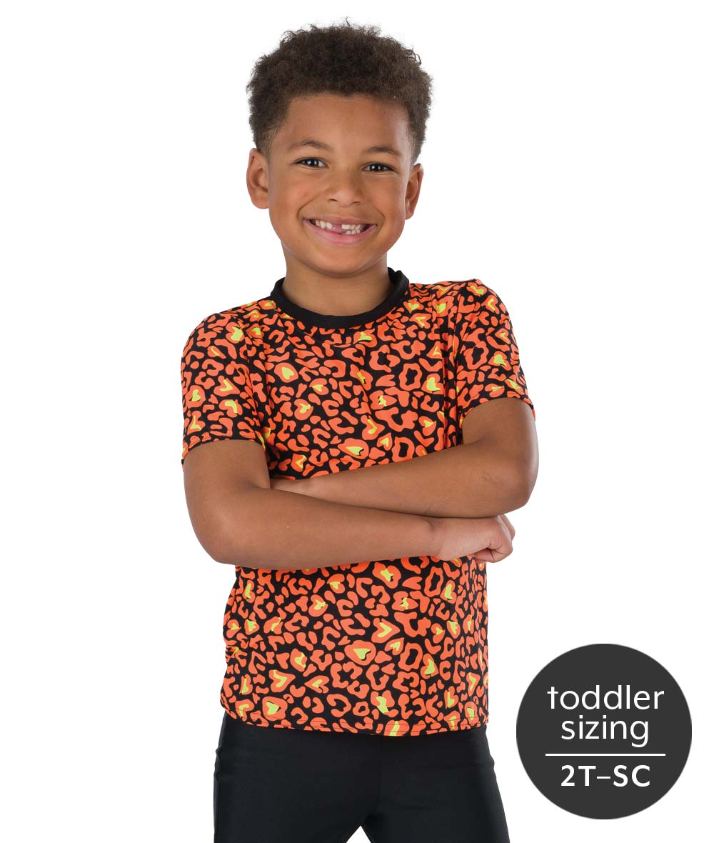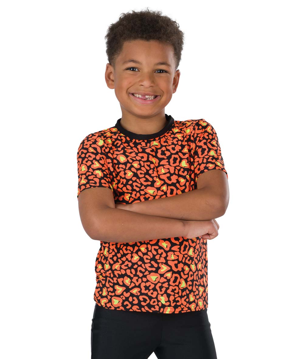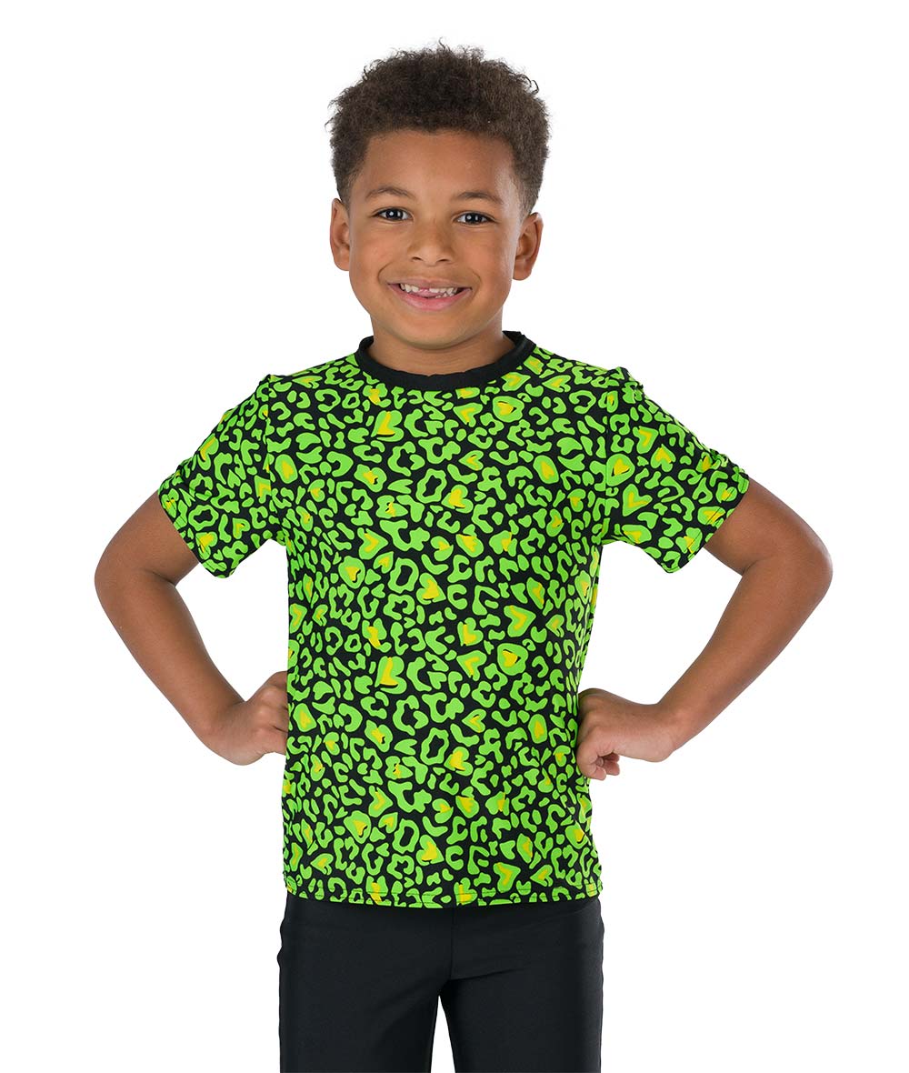 Leopard print and solid spandex top. Pants sold separately. Made in the USA.