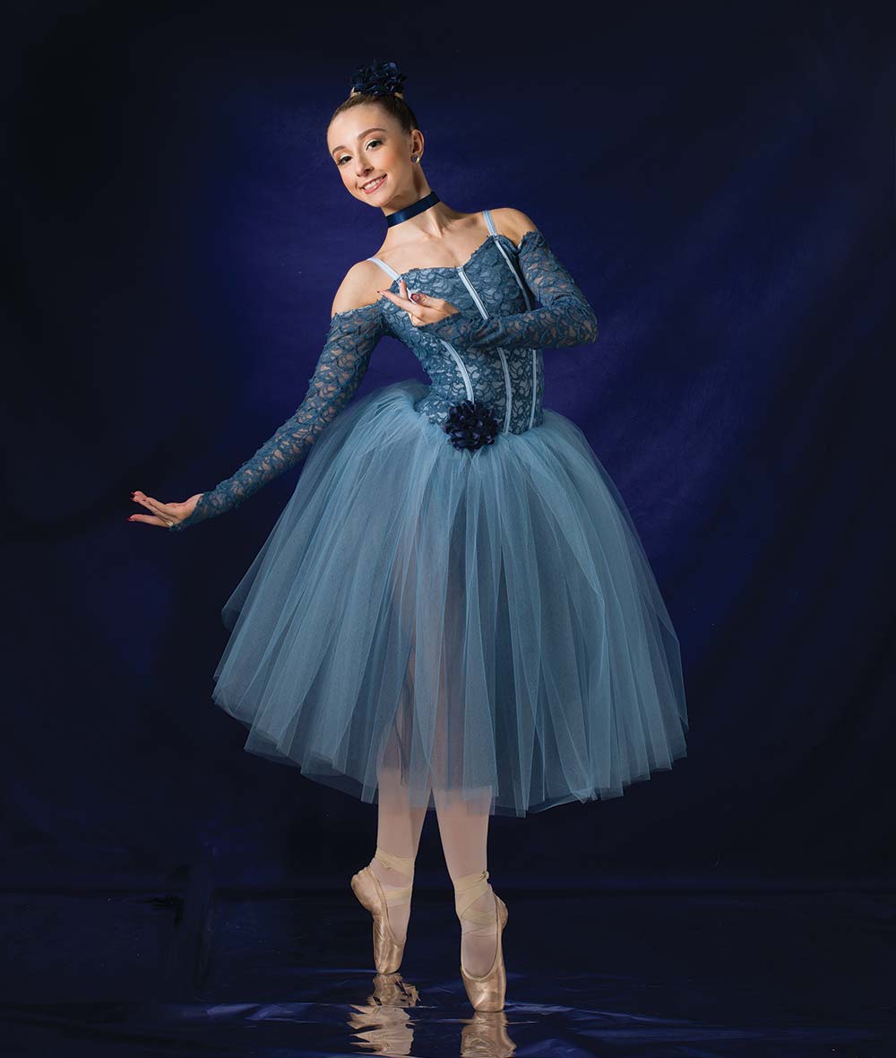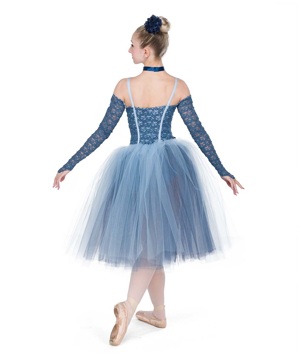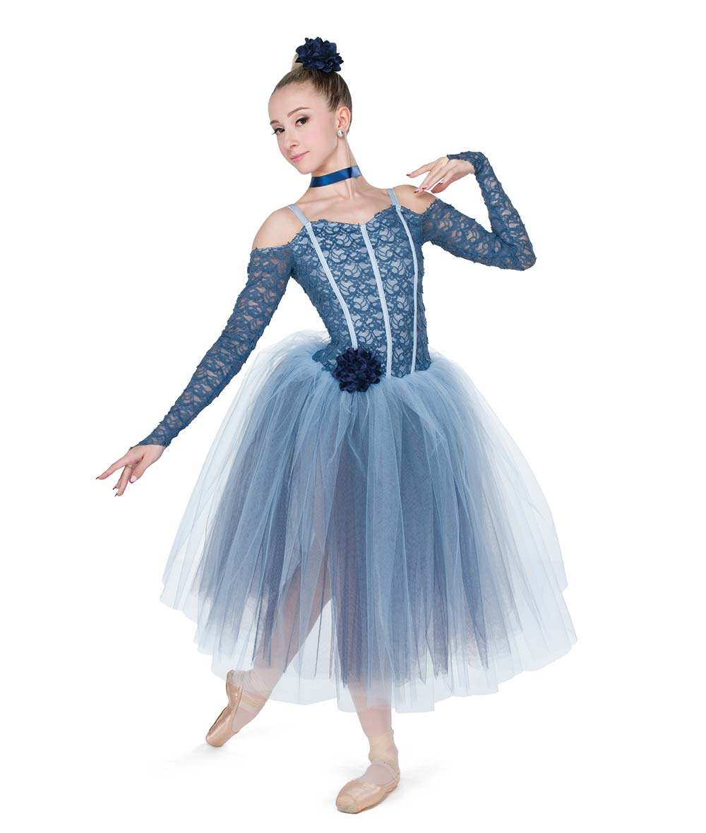 Floral stretch lace and spandex long sleeve leotard with attached flower and tulle tutu. Lined bodice. Made in the USA.
