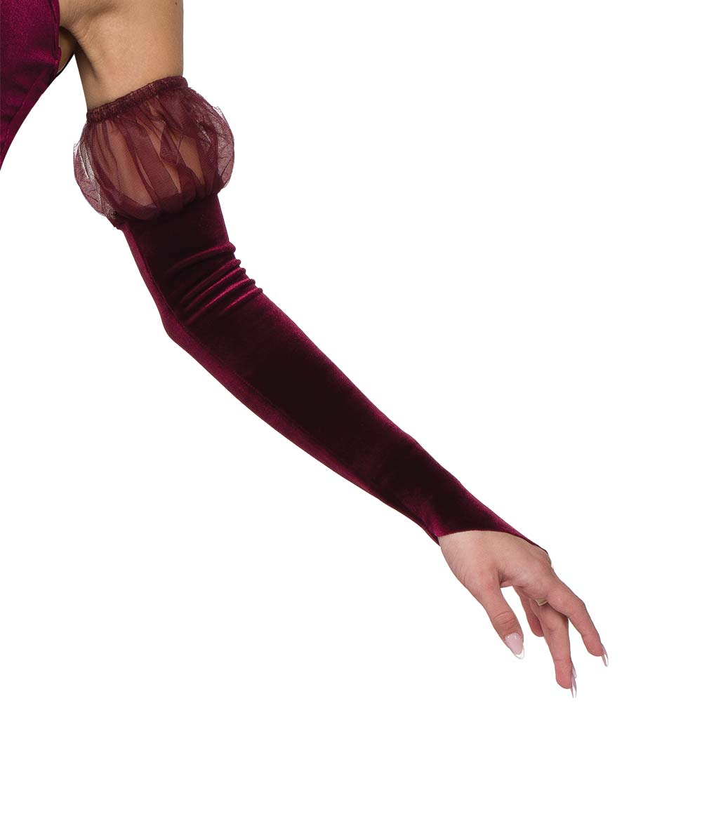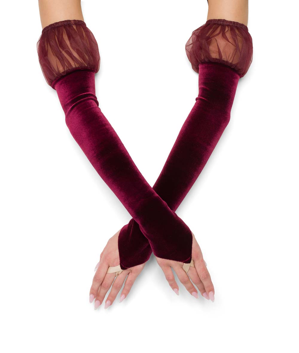 Velvet and mesh over-the-elbow mitts with tan elastic finger loop. Made in the USA.