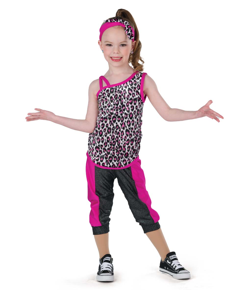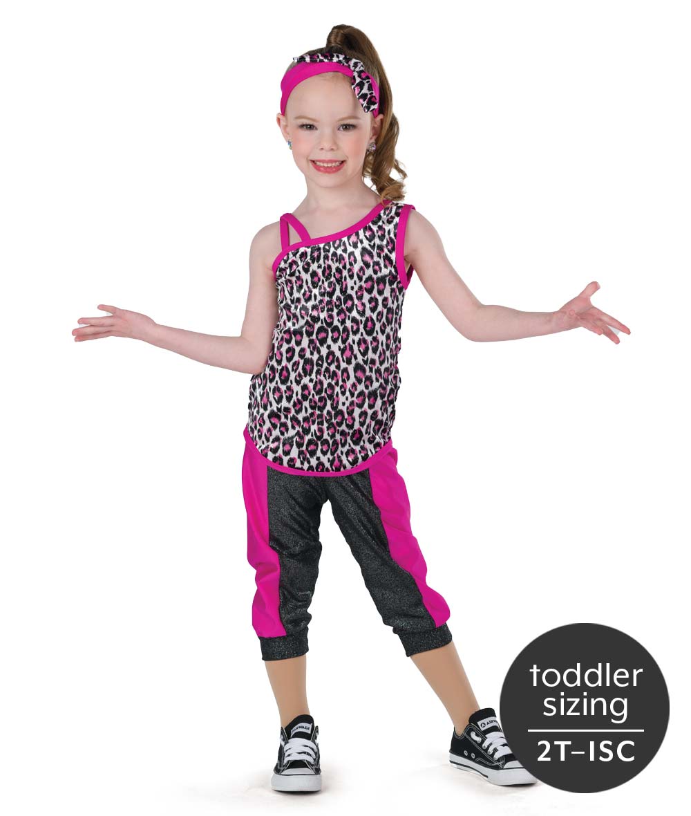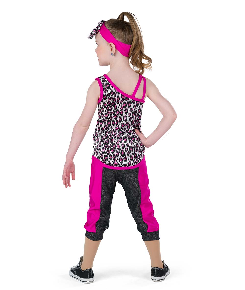 Glitter leopard print velvet tank top. Foil french terry and spandex cropped joggers. Made in the USA.
