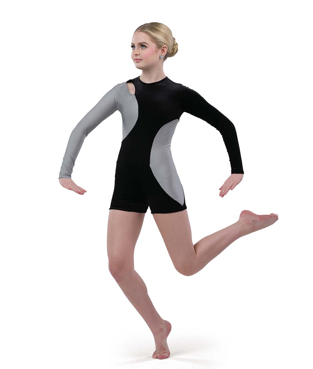 Spandex and velvet long sleeve shortall with zipper back. Made in the USA.