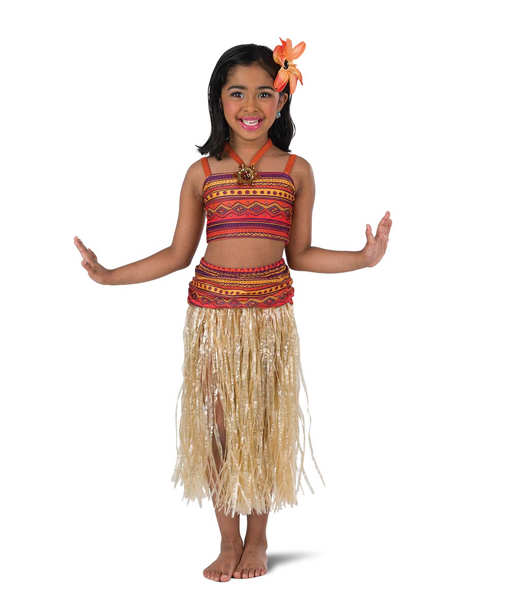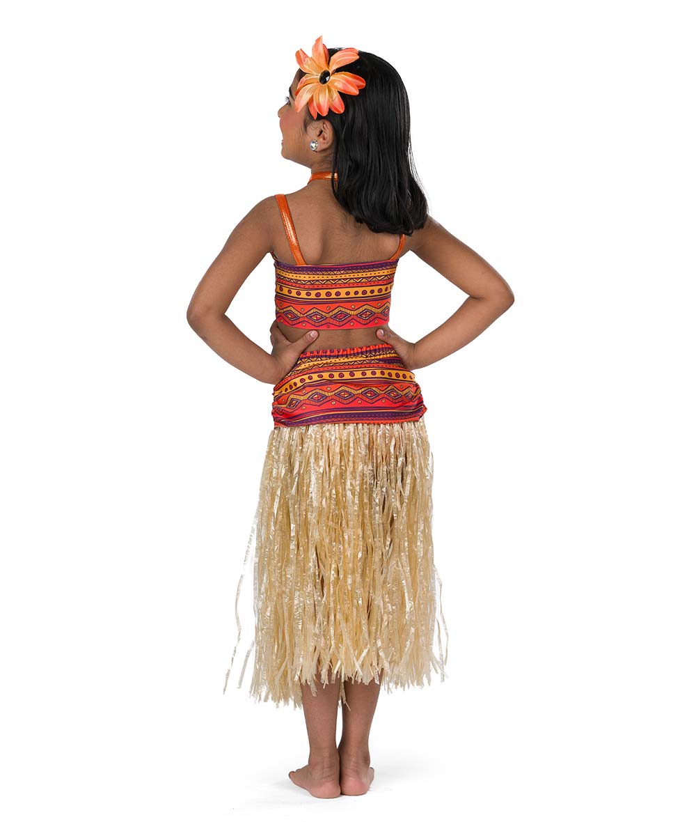 Pattern spandex crop top with attached sequin applique. Spandex panty with pattern spandex drape over removable grass hula skirt. Pattern will vary. Made in the USA.