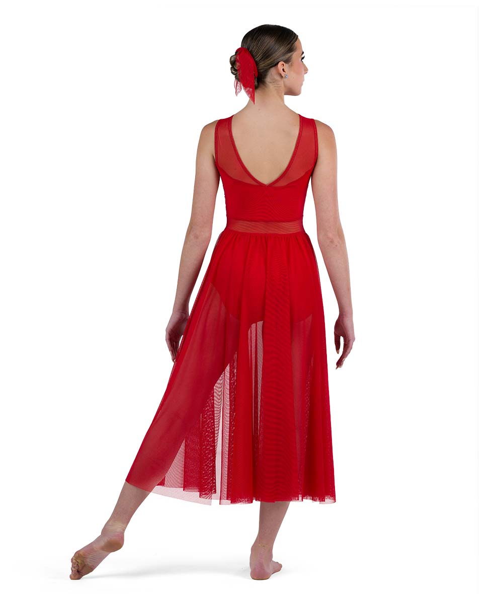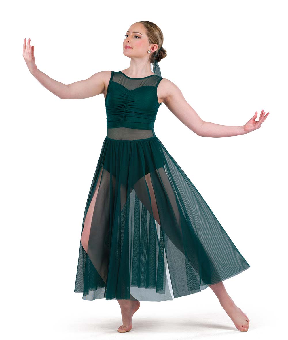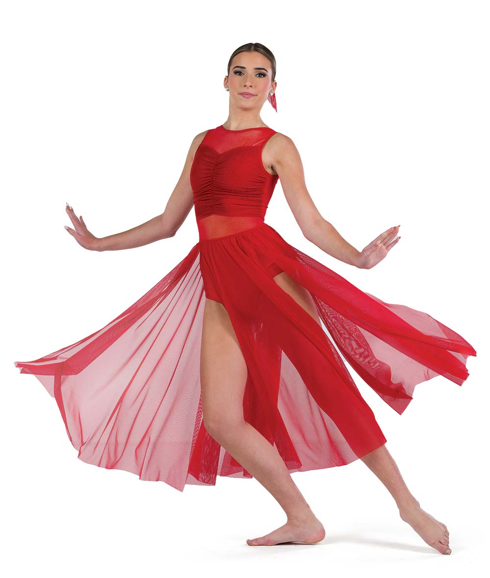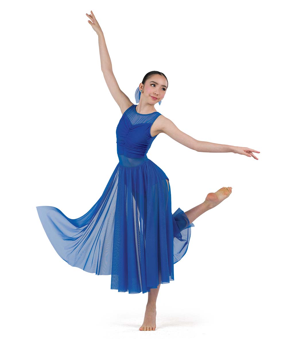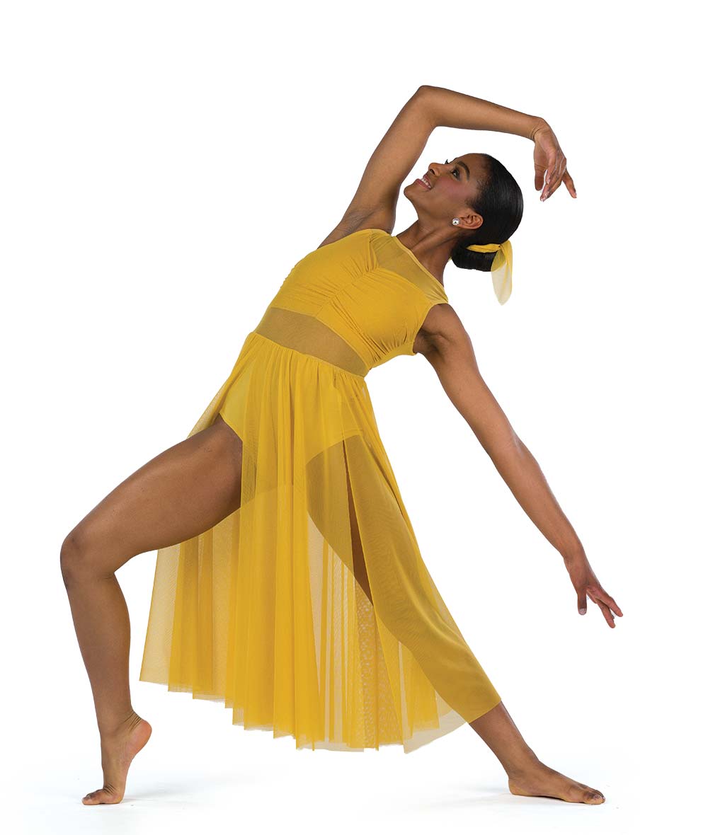 Spandex and mesh leotard with twirl panty and mesh midi skirt. Made in the USA.