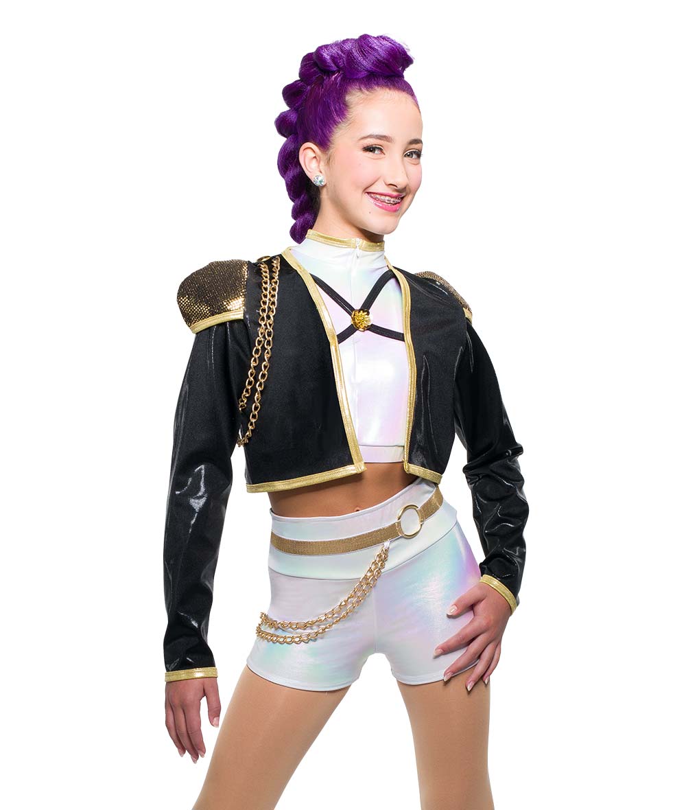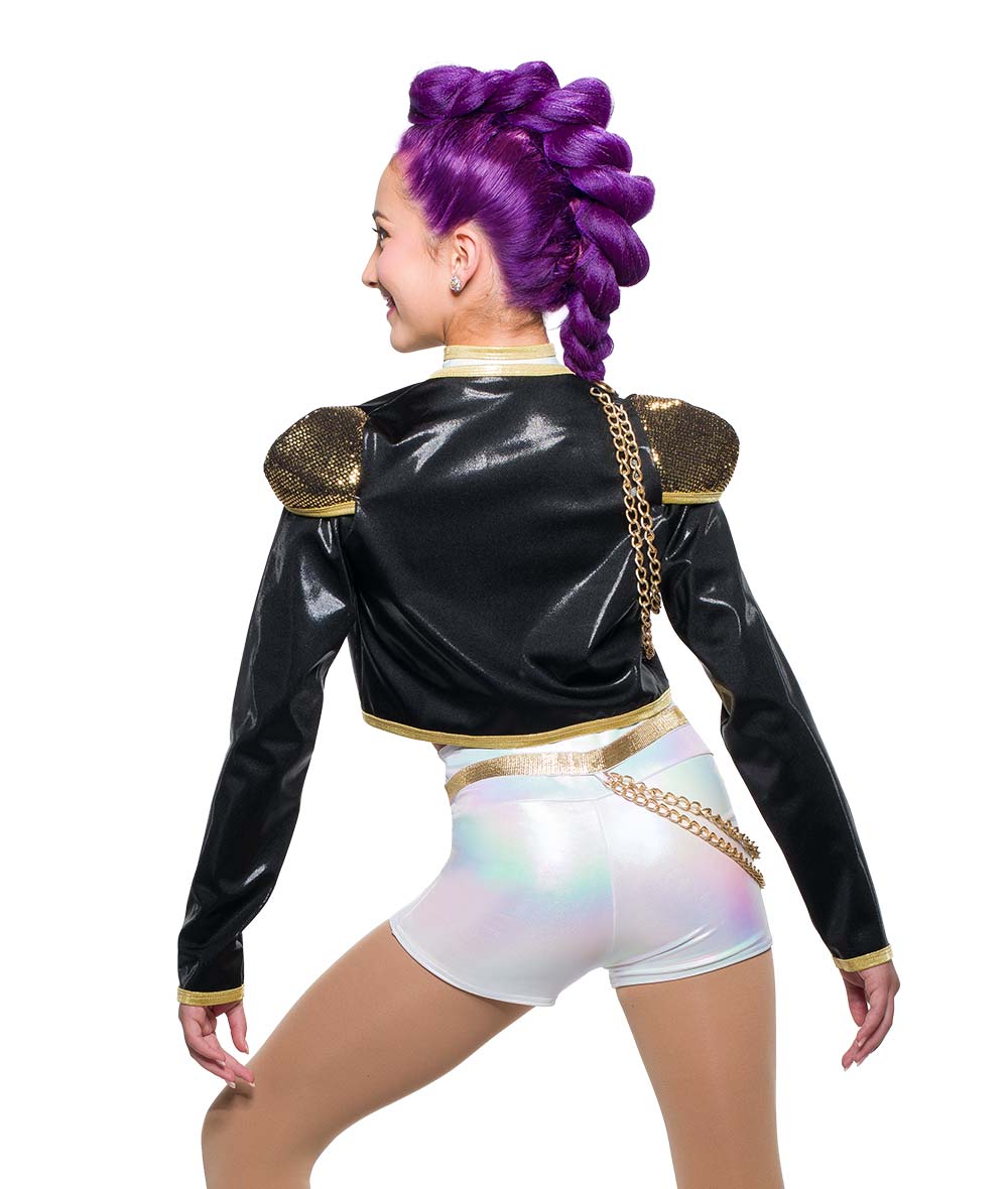 Foil lycra jacket with sequin slinky and foil lycra trim. Attached gold chain. Made in the USA.