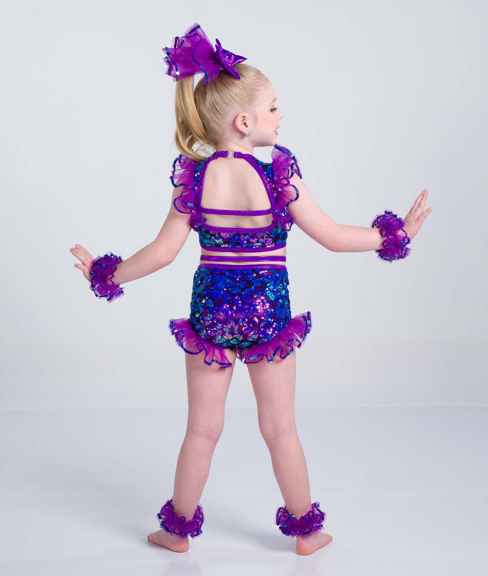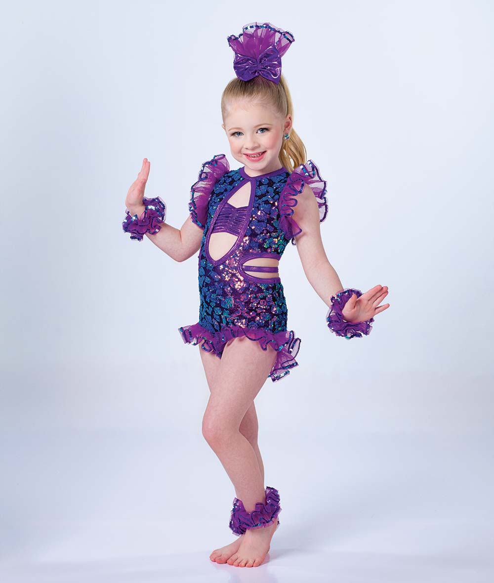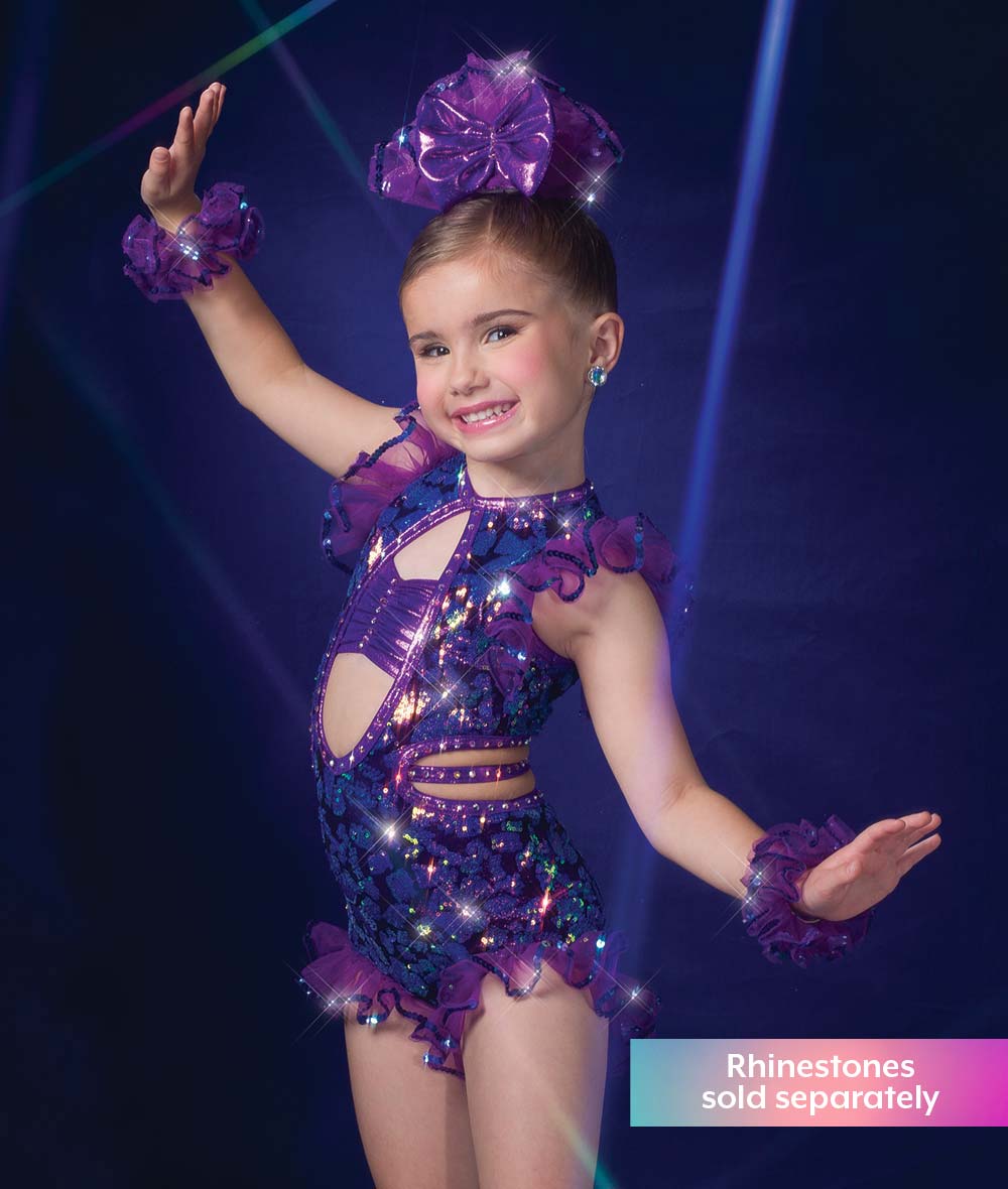 Lined cluster sequin mesh leotard with foil lycra trim and twirl panty. Attached sequin trimmed organza ruffles. Made in the USA.