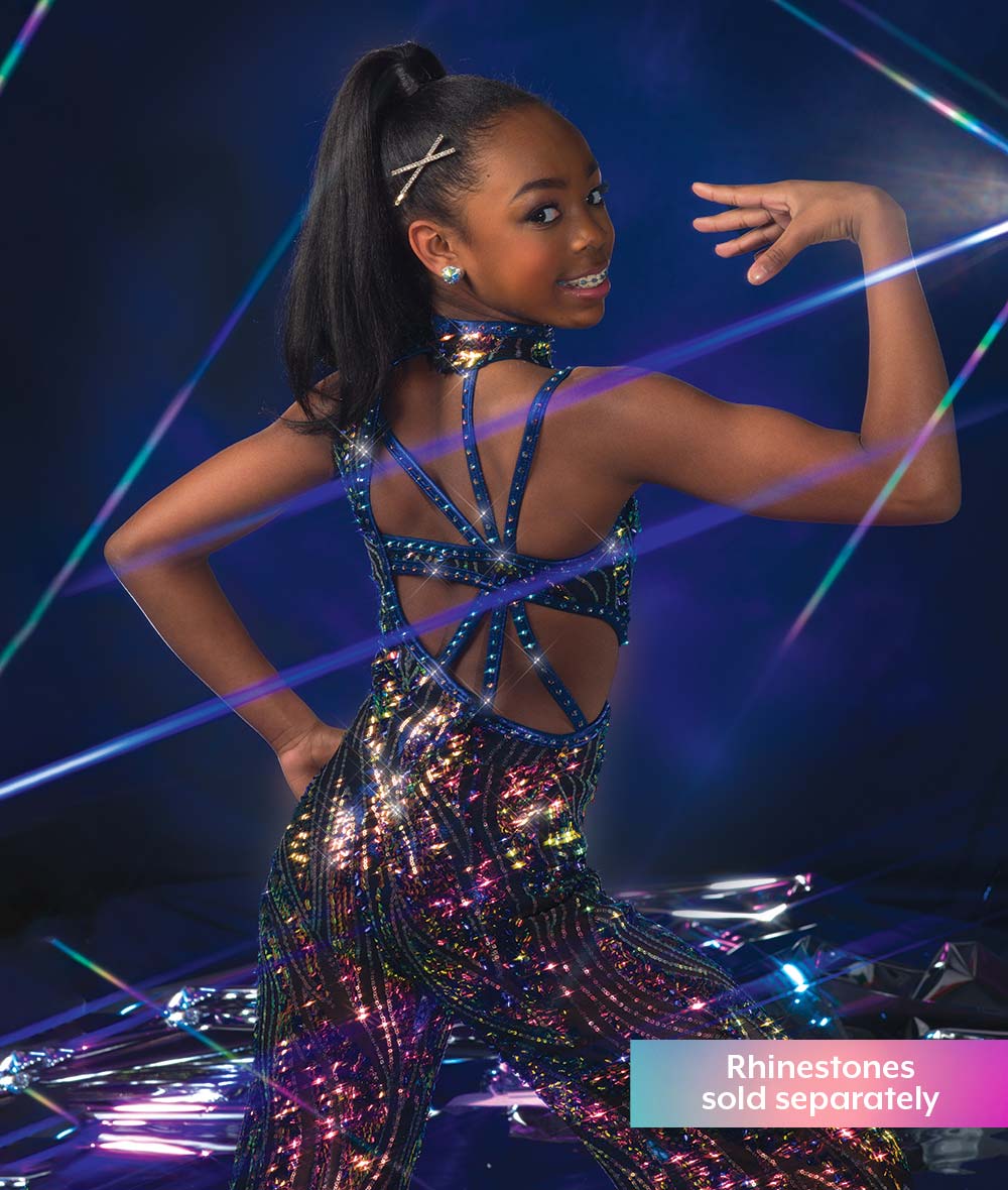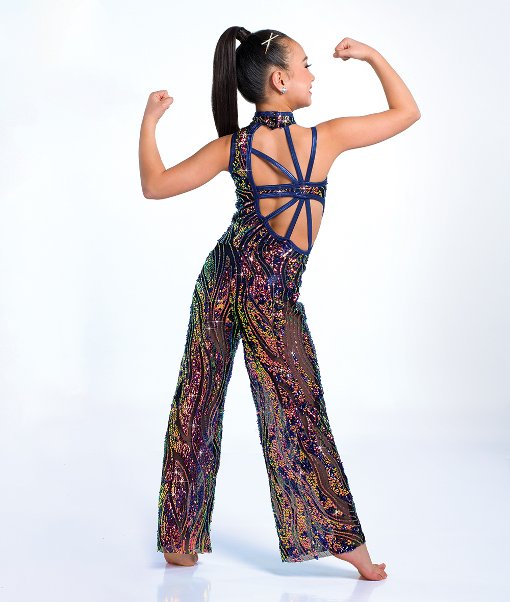 Wavy mixed sequin mesh wide-leg jumpsuit with foil lycra trim over attached twirl panty. Open back. Made in the USA.