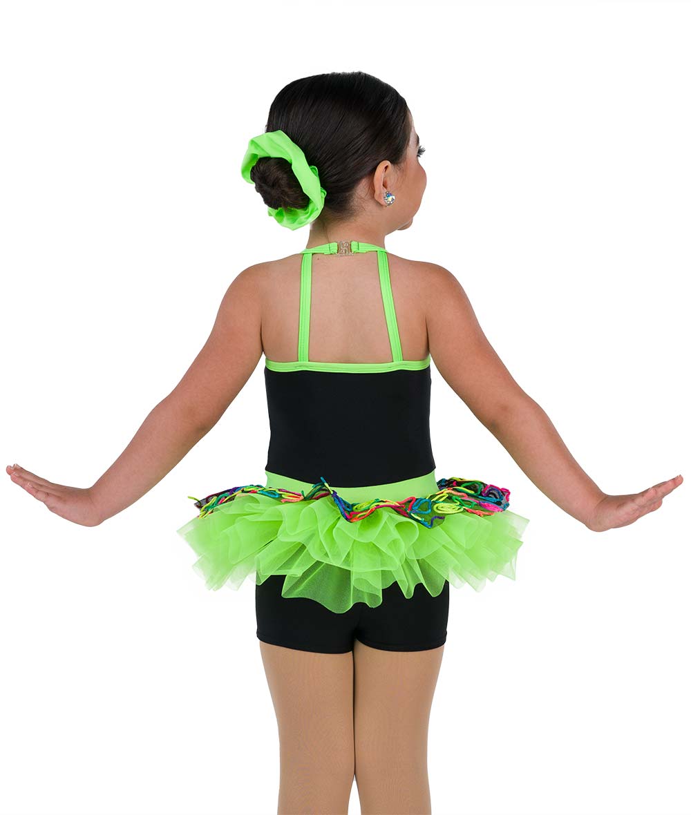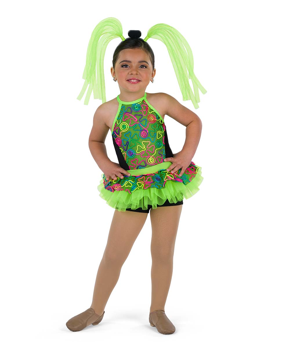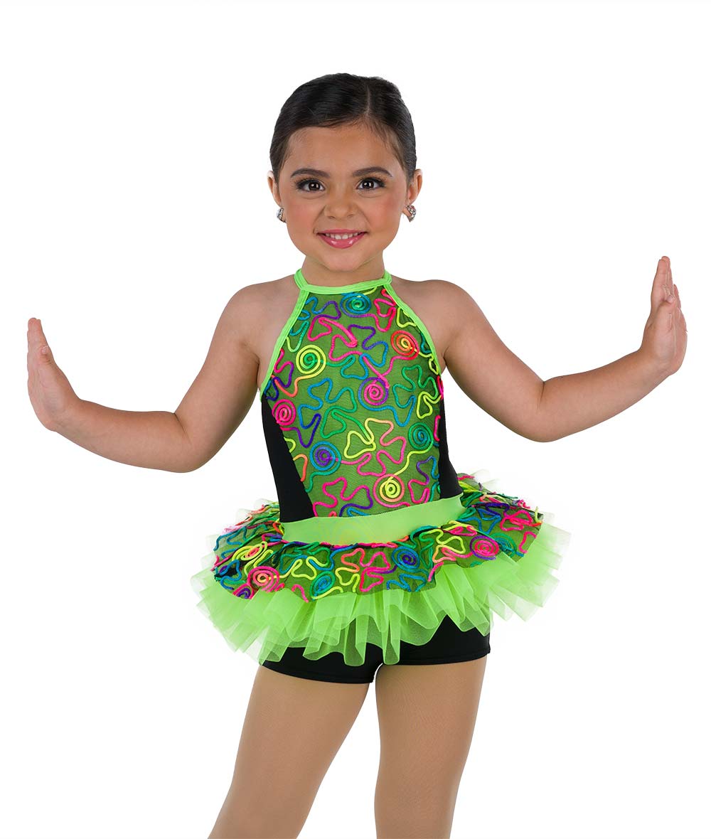 Lined embroidered ribbon on mesh and spandex skirted shortall with attached organza skirt. Headband sold separately. Made in the USA.