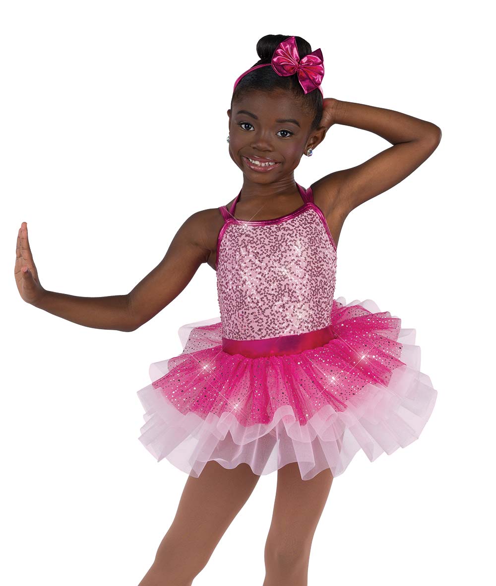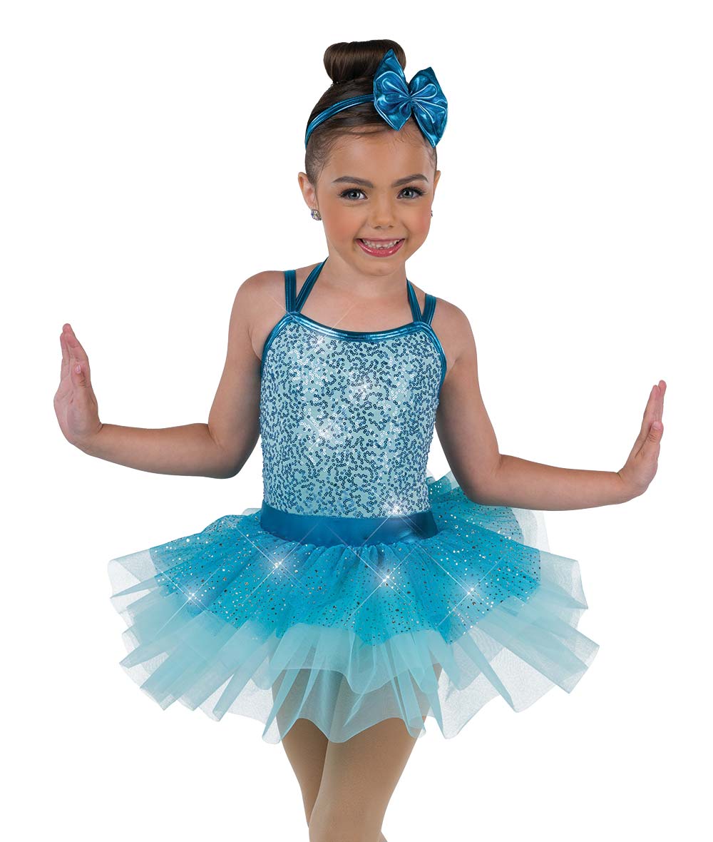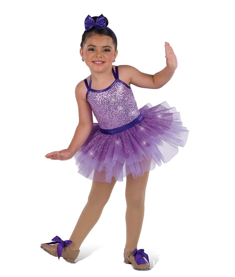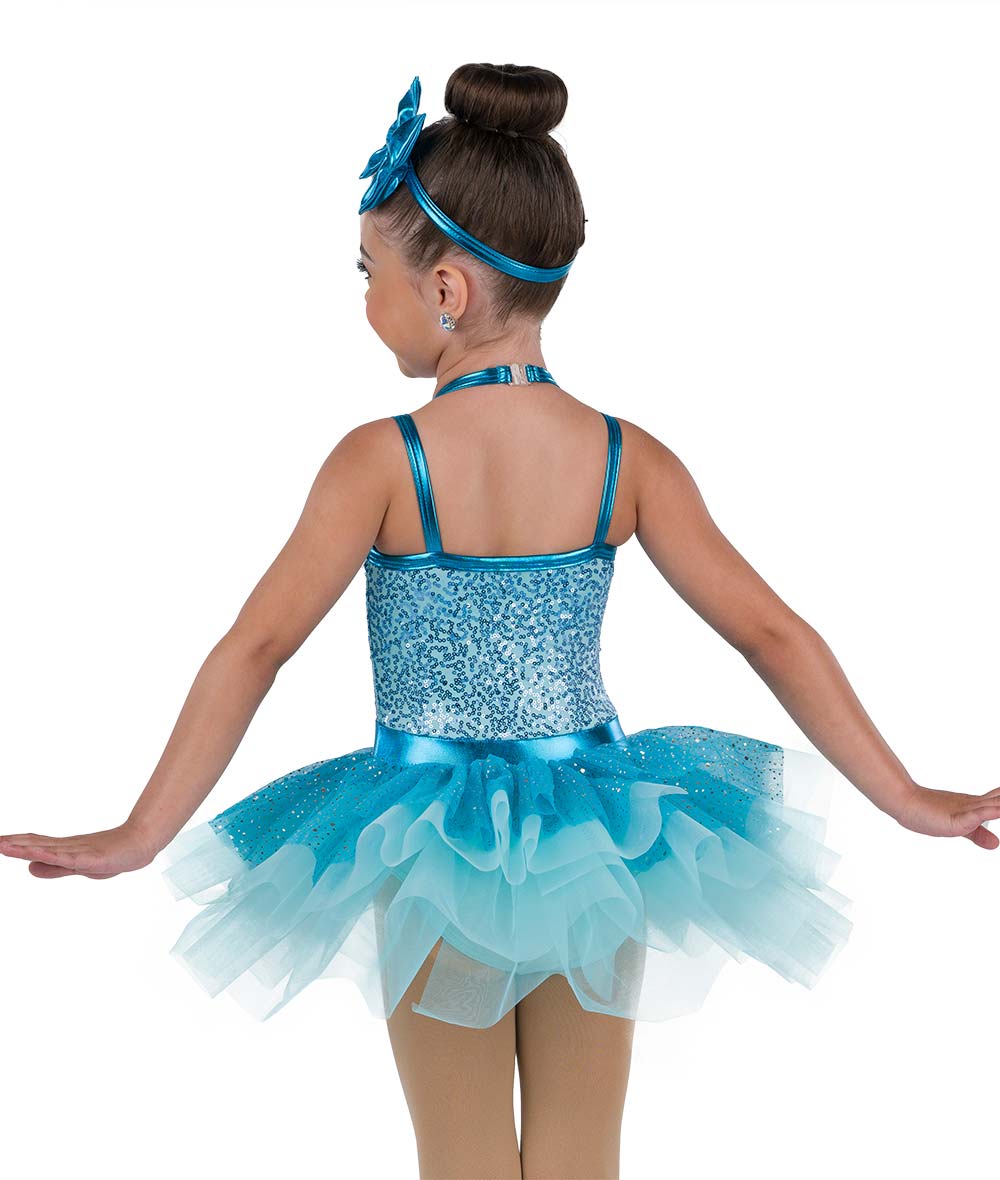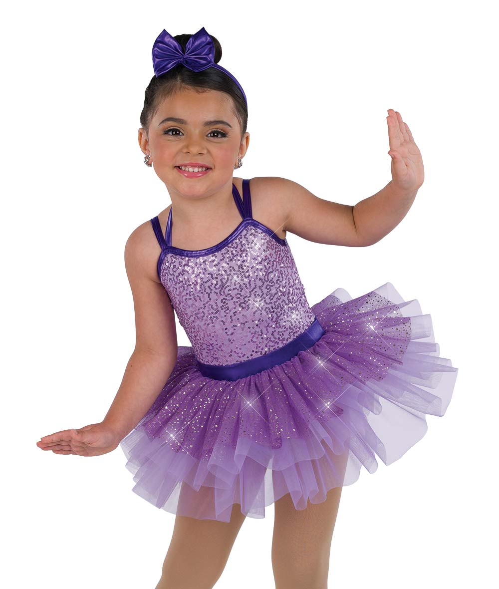 Lined sequin and solid spandex leotard with flat foil lycra trim. Attached pleated foil dot mesh and organza tutu. Shoe bows sold separately. Made in the USA.