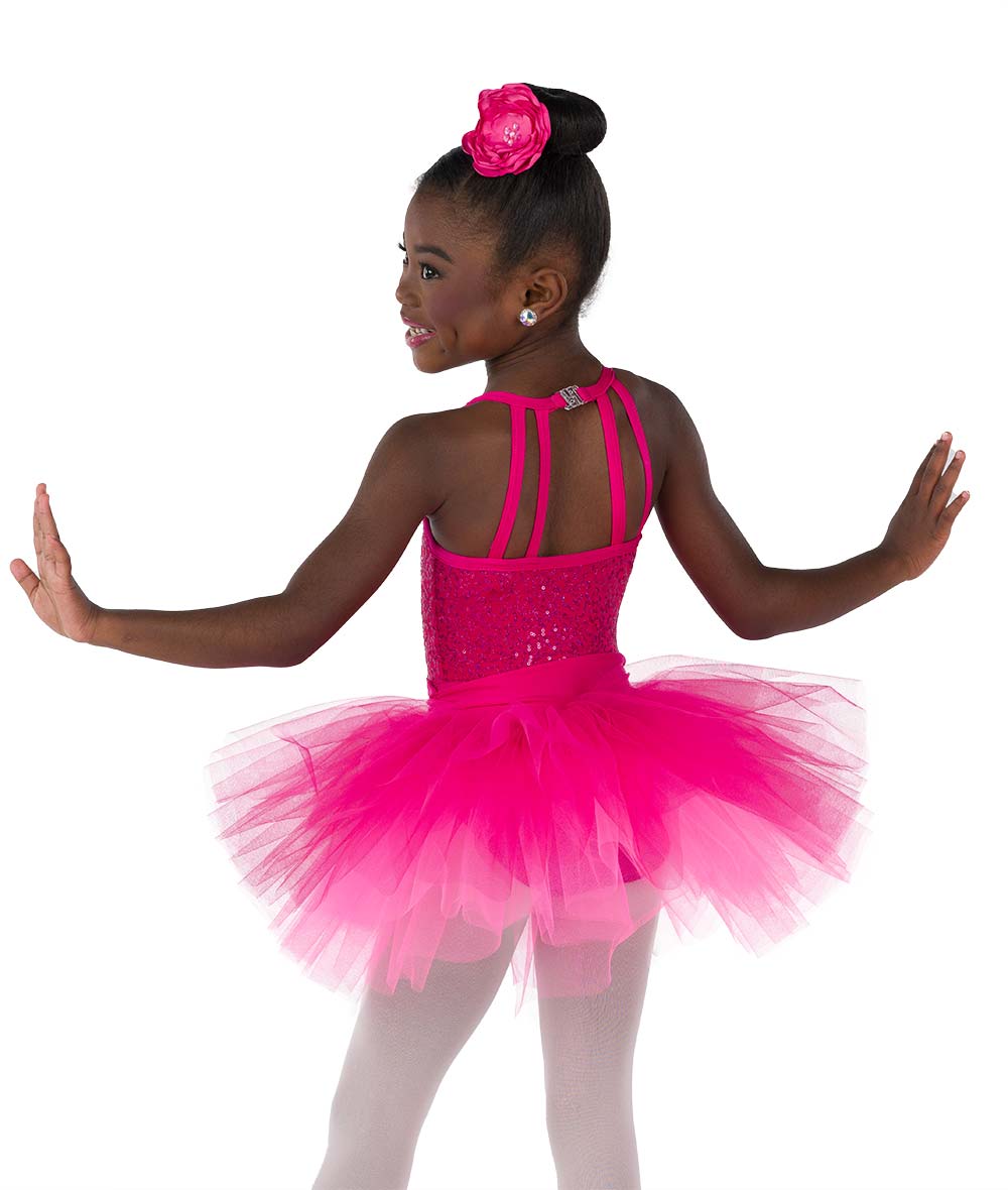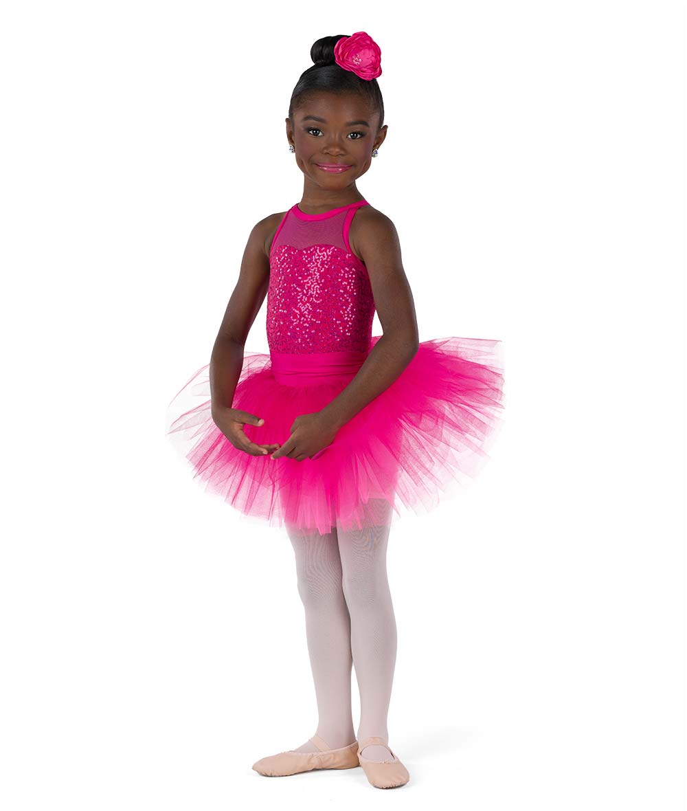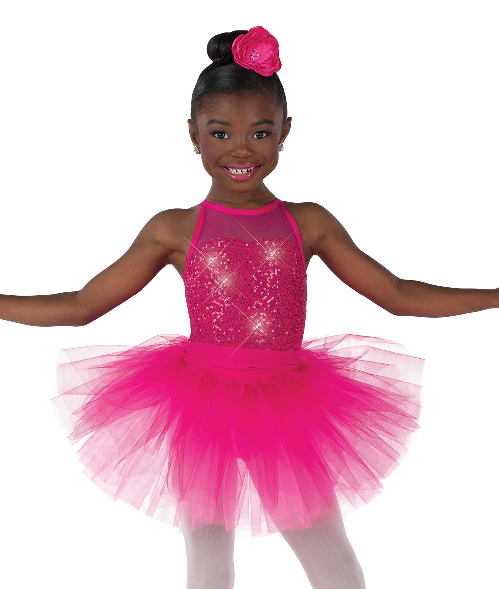 Lined hologram sequin and solid spandex leotard with mesh yoke and attached tulle tutu. Made in the USA. Comfort Seamed. No-Itch Lining.